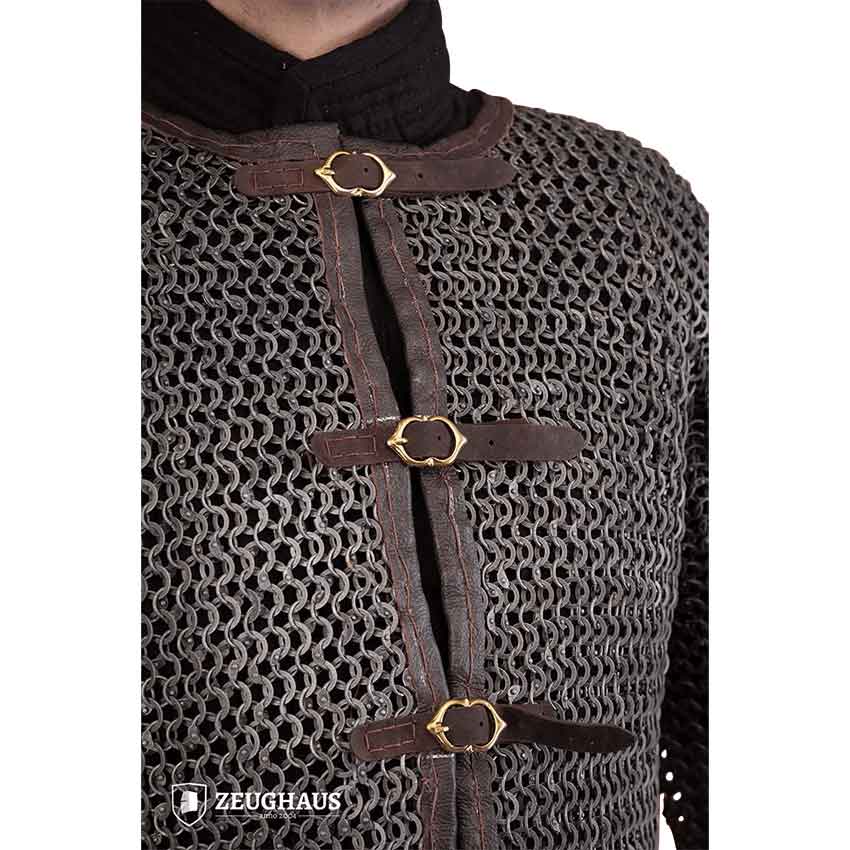 This chain armor jacket opens in the front for easy wearing. The adjustable leather straps ensure you get the perfect fit. Each buckle has a brass finish for added detail. Thanks to these leather straps and buckles, you can layer this haubergeon over your outfit like a coat. The short sleeves end around the arm just below the elbow, where they then end in leather-trimmed cuffs.
