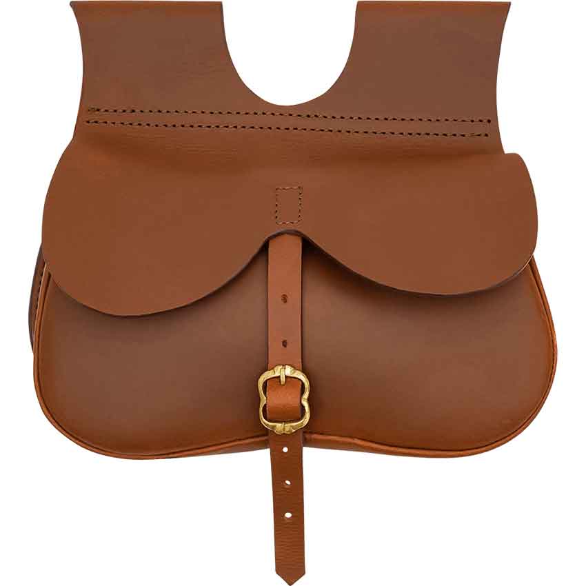 For hardy adventurers and rugged warriors, the Buckled Travelers Pouch in brown is the perfect companion. This natural leather belt bag has a roomy shape for small essentials, and its front flap closes securely with a brass buckled strap. With its slightly curved, kidney pouch shape, this medieval bag sits nicely at the side of its wearer, and it easily attaches to a belt using the two wide loops at the top. The curved front flap lends an extra touch of style to its overall design. For LARP, reenactment events, Renaissance fairs, or other medieval events, this weathered leather belt bag is perfect for keeping your must-have gear secure.