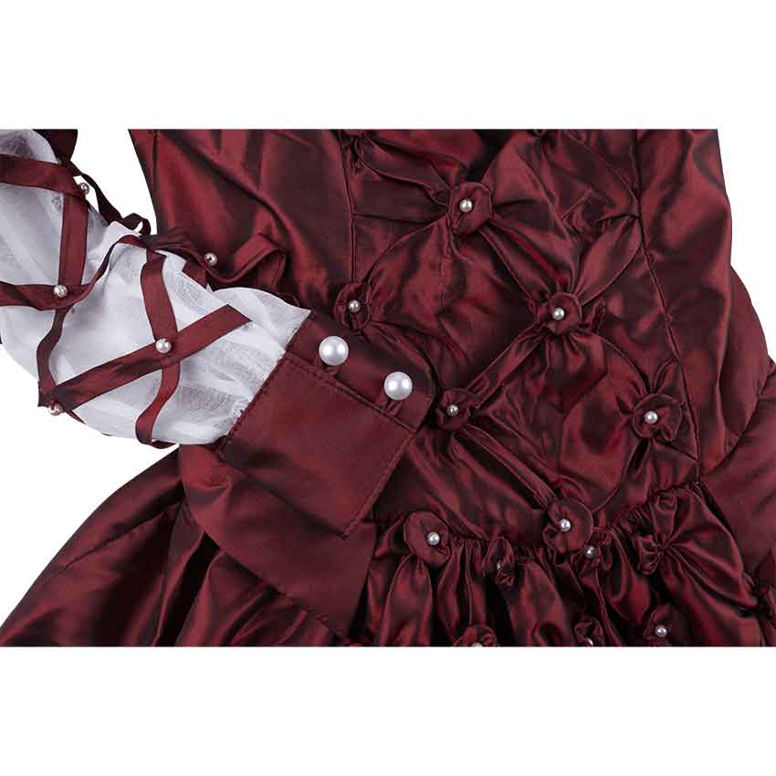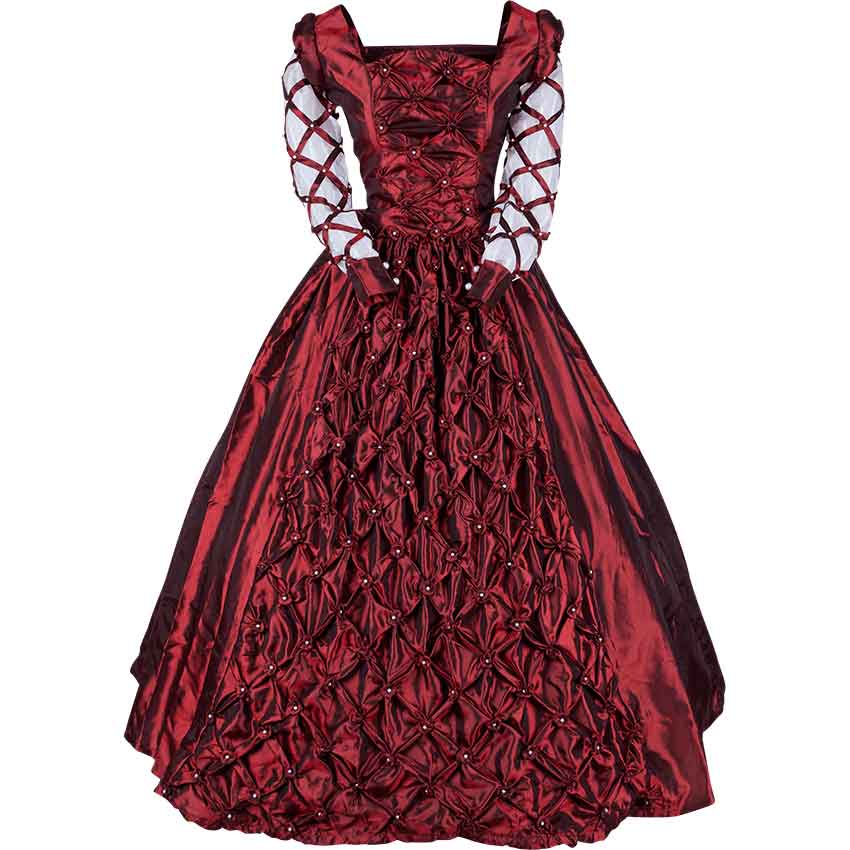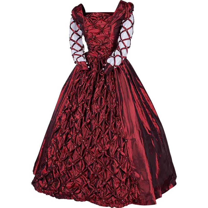 The Burgundy Medieval Ball Gown is a charming medieval gown that has over 150 pearls embroidered into it. The Burgundy Medieval Ball Gown closes with laces in the back. This dress is pictured with the Medieval Hoop Skirt (MCI-146) and the Crescent Bum Roll (MCI-421), each sold separately. This Burgundy Medieval Ball Gown is great for Medieval Weddings, Renaissance Fairs and Medieval re-enactments. Be the star of your next fair or event with this beautiful Burgundy Medieval Ball Gown.