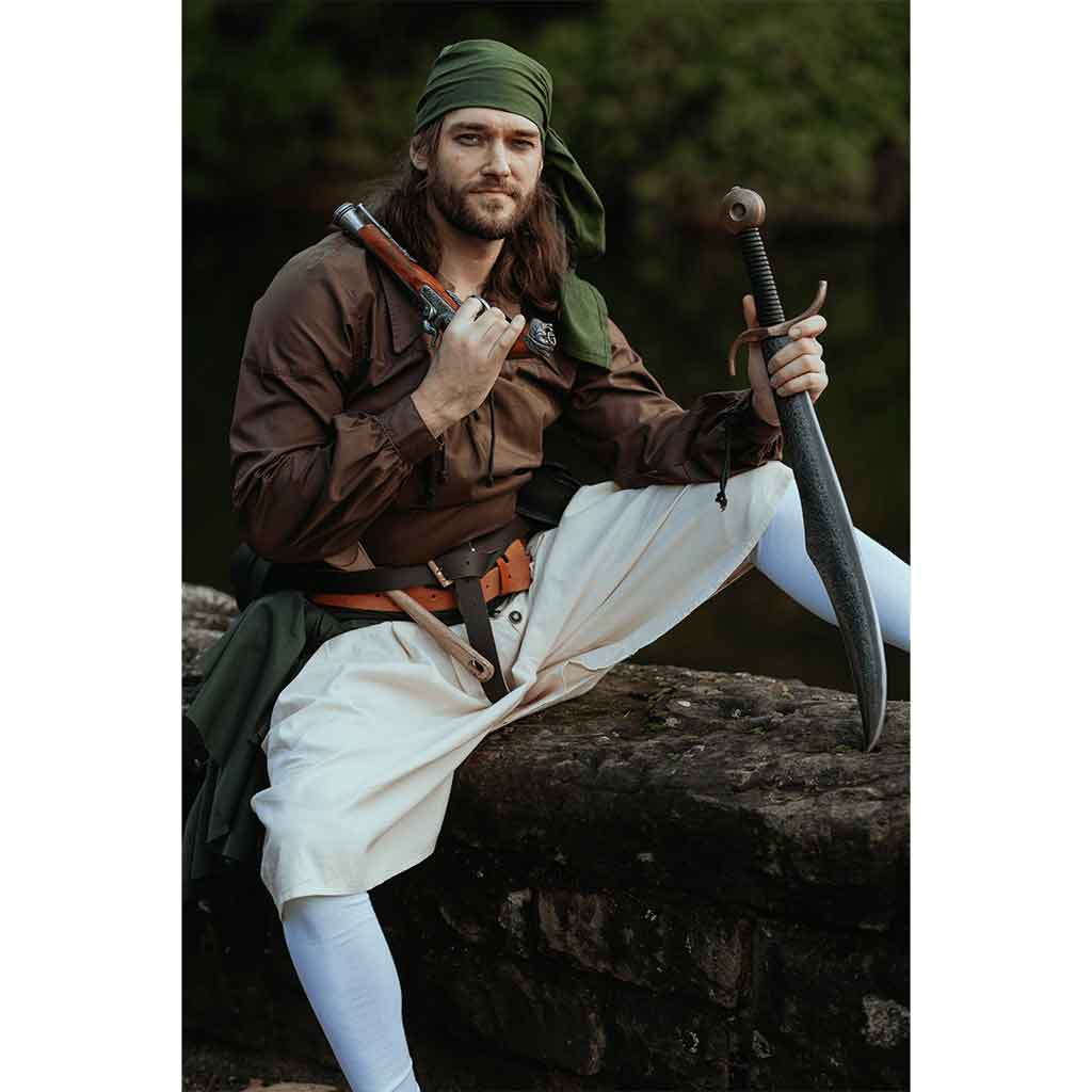 Personalize your pirate ensemble even further by choosing from a variety of accessories. What’s more, you get to save 5% when ordering this pirate fantasy outfit. This ensures you get a great cohesive pirate look without dooming your treasure chest to Davy Jones’ locker. Secure your outfit with a variety of belts like the Adolar and the Louis. When you’re thirsty on the high seas or exploring new lands searching for plunder, you can add the Doran Water Bottle to your outfit to stay hydrated. Strike a formidable presence wielding the 18th Century Italian Flintlock Pistol, a realistic and historically inspired decorative weapon. If you’re looking for the perfect finishing touch to your ensemble, then add the Emil Scarf to wrap around your head and your waist for added style. All this and more await to let you tell your own tale of swashbuckling adventure.