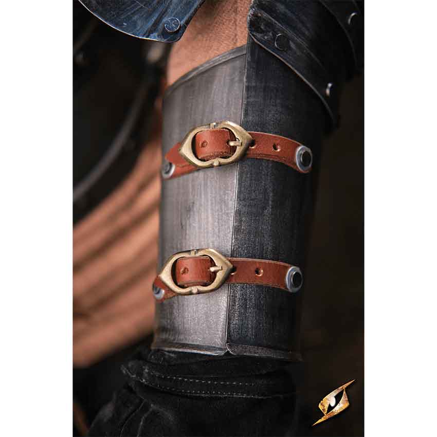 Next, there is a small plate on each upper arm before the elbow couters. The couters have fan-shaped sides to protect the inner elbows. Then, there is another small plate before each forearm section. These elbow plates feature ridged borders with stud-like rivets. The forearm plates cover the arms on the outsides and insides with a hinged design. The hinged forearms secure closed with straps. This medieval arm armour is ideal for wearing to your next LARP battle or cosplay event. They work for a variety of characters.