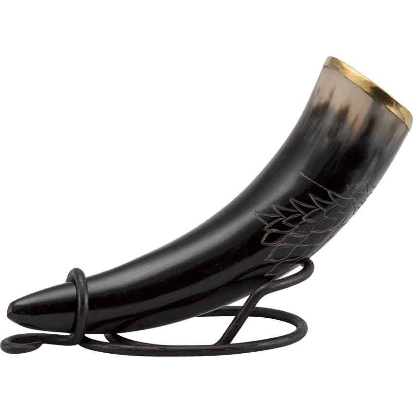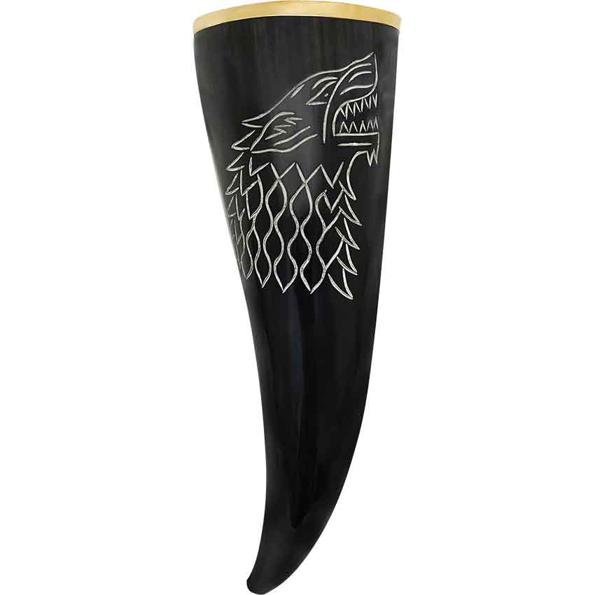 The most famous wolf in Norse mythology is the monstrous Fenrir, destined to defeat all-knowing Odin at Ragnarok. Let the legends of Viking lore ring through your halls when you feast with the Carved Wolf Drinking Horn. The front of this Viking drinking horn is carved with the head of a ferocious wolf with mouth open to reveal its wicked teeth. The brim of this natural carved horn cup has a layer of brass for a touch of splendor. Safe for drinking from and eye-catching to behold, this wolf head Viking horn makes a fantastic addition to both feastware and decor.