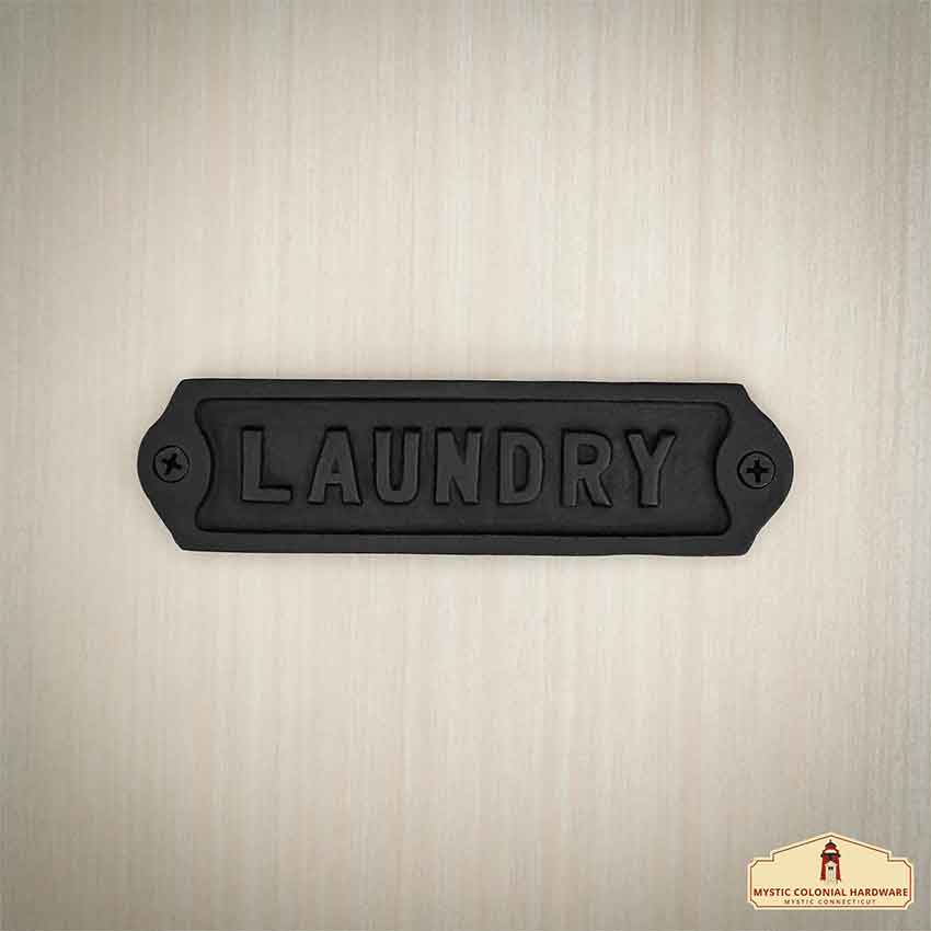 Along the center, the sign reads Laundry with raised lettering against an inset background. The sans-serif-style font gives the sign a classic appearance, allowing it to suit a variety of decors. It could easily look at home on a pirate ship or in a gothic mansion. Also, the sign adds a rustic touch and a historical feel to a modern home as well. Match it with the Cast Iron Washroom Door Sign for a cohesive look.