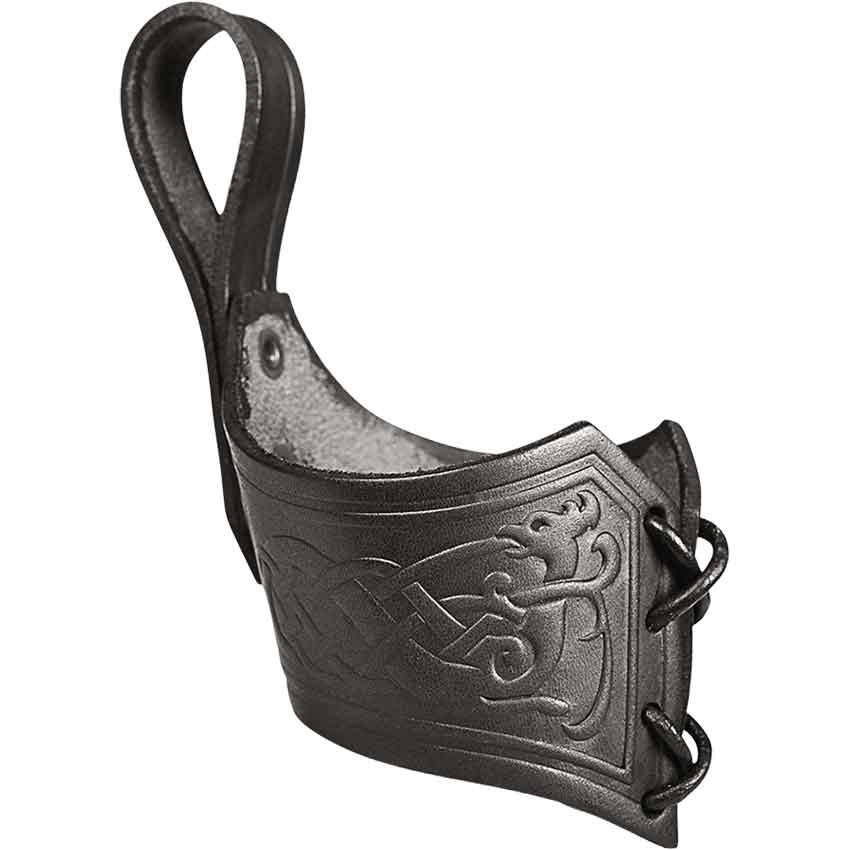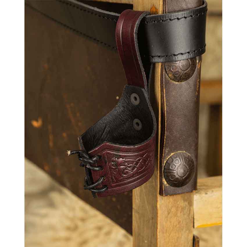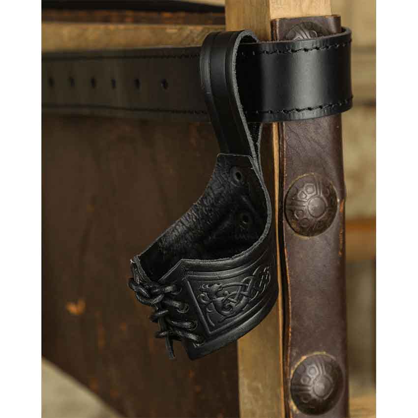 Any Viking warrior needs to keep their drinking horn on them so they can celebrate a victory. Carry any drinking horn in this Castagir Horn Frog. Handcrafted from premium 7-8 oz. leather, this horn frog comes in two sizes and four colors. It laces closed in front, allowing you to ensure a better fit. At the back, this holster has a belt loop. The loop allows the frog to slide onto a belt, not included. On the sides of the frog, there is a beautiful embossed pattern. The pattern features a knotwork design and stylized animal heads. The Castagir Horn Frog works equally well for LARP events, cosplay conventions, and reenactments.