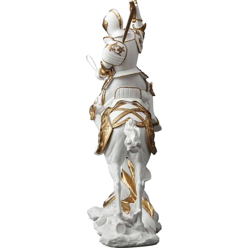 Sculpted from polystone, this knight statue is rooted in the ideals of chivalry and the martial orders of late medieval Europe. Inspired by late medieval knights and their prestige on the battlefield, every detail on this medieval cavalry statue is painted by hand to bring the epic history of the knights to life. Polystone which is a resin composite that utilizes powdered stone to create a sculpture that is lightweight like resin, but possessed of a marble white and metallic gold luster.