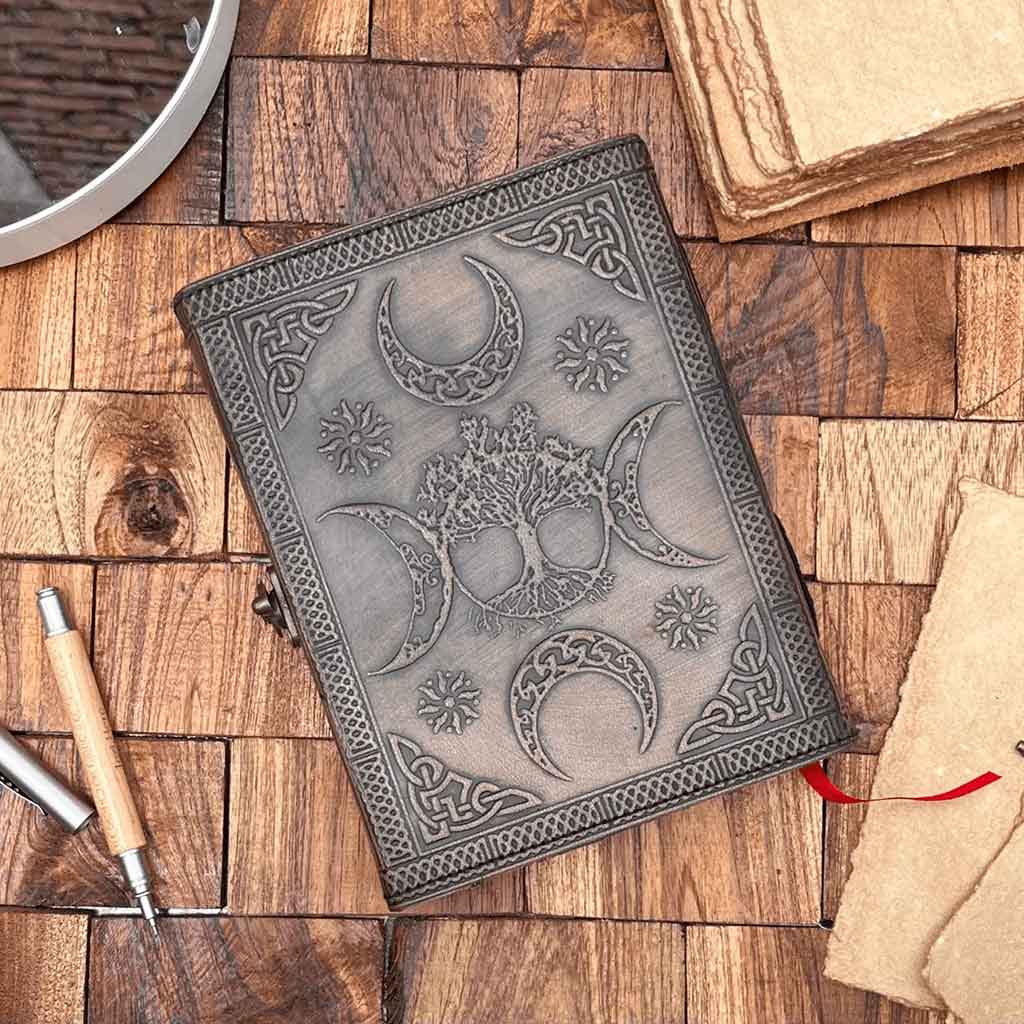 The back cover is embossed with intricate detailing inspired by Wiccan lore and the magic of nature. In the middle, there is an embossed tree of life growing over a full moon. There are crescent moons on each side of the tree. There are embossed starbursts between the moons for celestial detail. Each corner has knotwork accents. The front and back covers are bordered with textured trim. There is handstitched binding on the spine keeping the pages together.