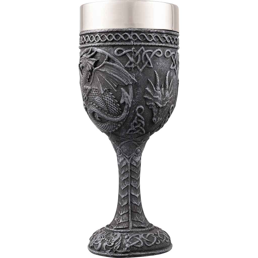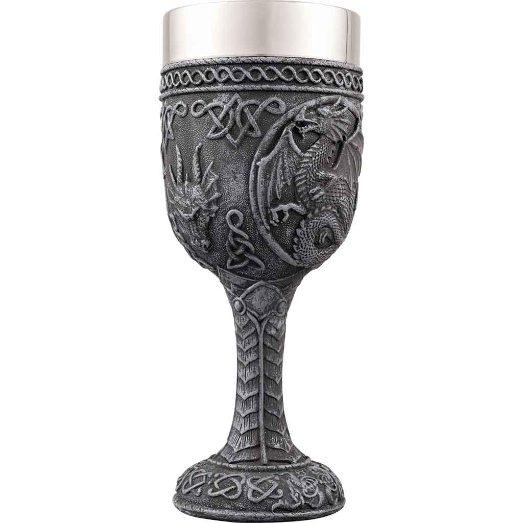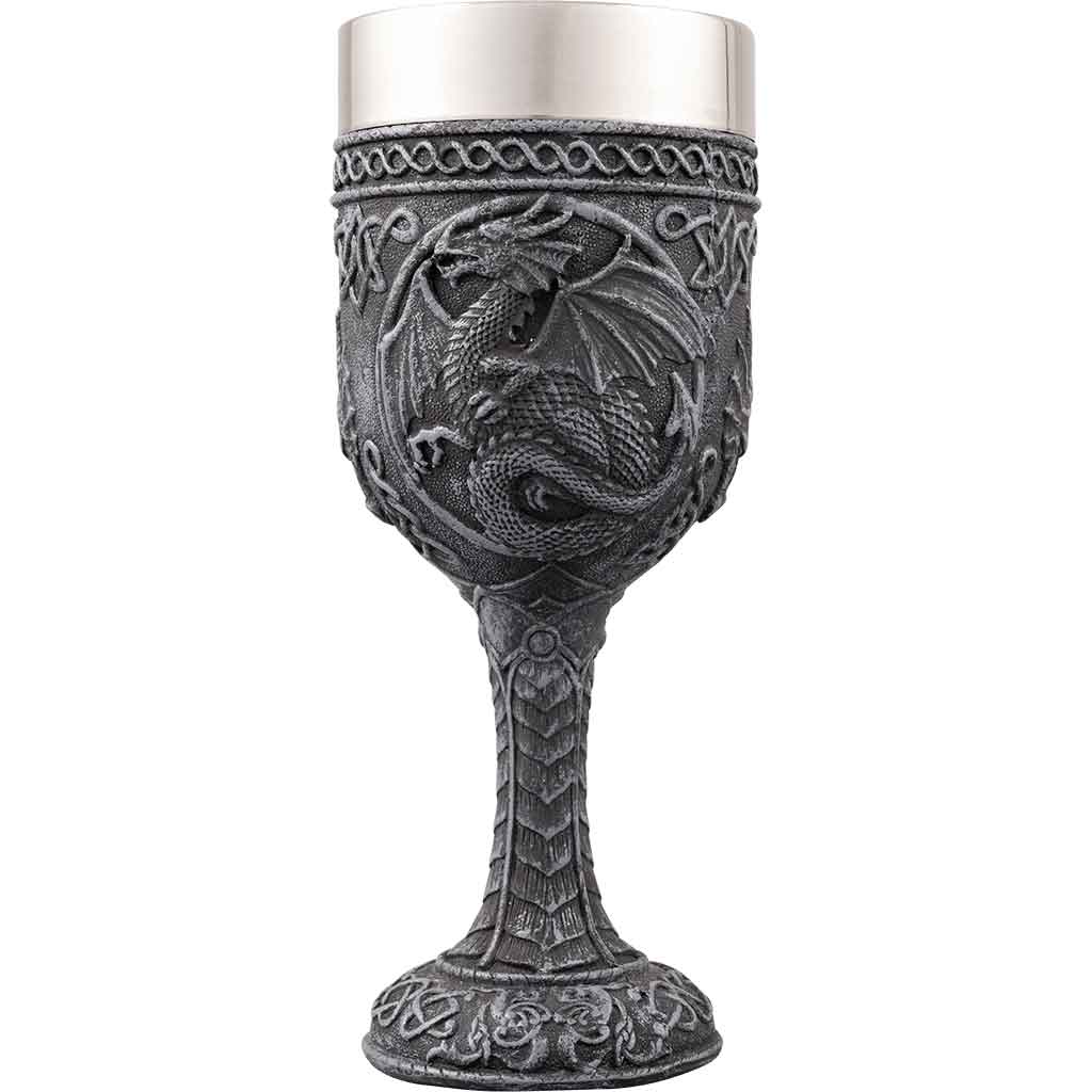 Dragons are one of the most powerful images of Celtic mythology, often being used as a heraldic symbol for the great and powerful. The Celtic Dragon Wine Goblet features a Celtic-style dragon with outspread wings and a barbed tail. The foot and stem of this glass display Celtic scrollwork and patterns, while the dragon forms the main image of the bowl with knotwork accents. Crafted from cold cast resin, this goblet includes a steel insert for functionality, letting you drink beverages from it as well as admire its fine craftsmanship. Fans of Celtic art can add the Celtic Dragon Wine Goblet to their daily table setting or save it for special occasions.