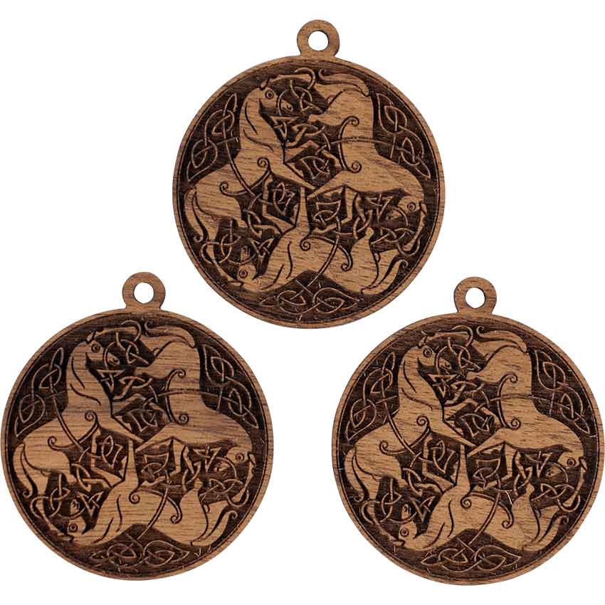 Crafted by Dragon Forge Leather from walnut wood, this set depicts three ornaments with intricately engraved horses on a knotwork setting. These ornaments are also circular. These Celtic Christmas ornaments come as a set of three. The walnut wood lends them a rustic texture. The horses engraved in the center form the spiritually significant triquetra symbol. Surrounding the horses is engraved Celtic knotwork. The horses and the knotwork border are a lighter color against a darker background. A hole at the top of each ornament allows you to slip a hanger or string through it.