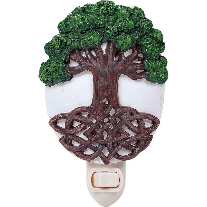 In Celtic mythology, the tree of life symbolizes harmony with nature and rebirth. What better way, then, to ensure that you have a harmonious sleep and a rejuvenating awakening than with the Celtic Tree of Life Night Light? This hand-painted resin night light depicts a large brown tree against a white background. The green leaves of the tree frame the top of the light, and its roots, tangled up in an elegant display of Celtic knotwork, form the bottom. The Celtic Tree of Life Night Light fits any standard US 120-volt outlet, allowing you to drift away to sleep beneath the glow of a sacred Celtic symbol.