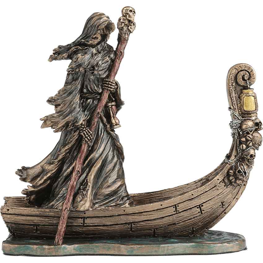 Crafted from polystone, every detail on this Charon statue has been painted by hand to show off a true passion for art. The design depicts Charon, ferryman of Hades in Greek mythology, sailing on the river Styx in his iconic boat. The statue is painted with a bronze finish.