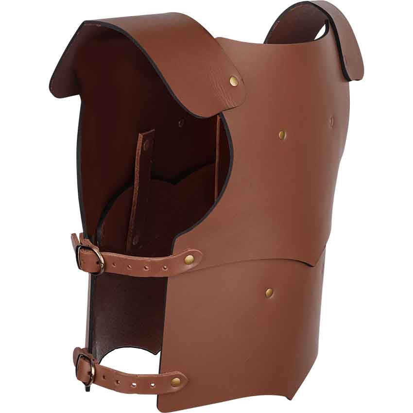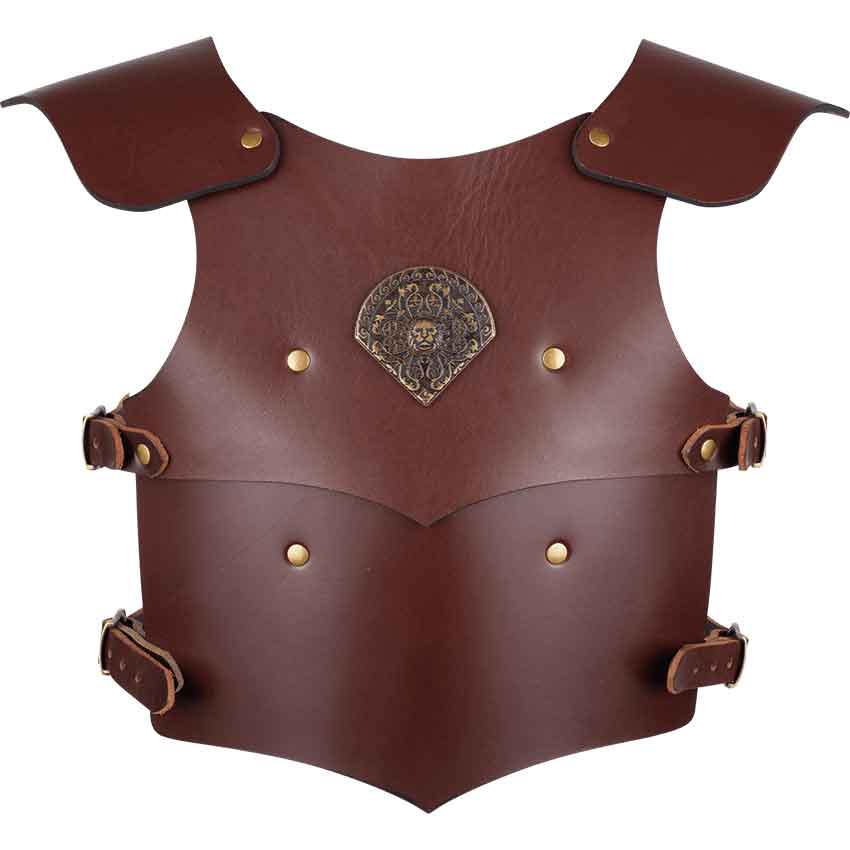 The term lionheart is used to describe someone who possesses exceptional courage. Your child will love to suit up in this Childrens Lionheart Armour while they learn to properly wield a sword and shield like the knights of old. Hand crafted in our shop from 8/9 ounce leather, this childs armour is available in black, red, green, or blue with silver-tone hardware or any shade of brown with antique brass hardware. The leather harness is accented with a fan shaped cast metal ornament displaying a lion head surrounded by curling vines. The youth armour is worn over the shoulders and secured in place with adjustable buckles and straps at the waist. Our Childrens Lionheart Armour is offered in three different sizes. Equipping your child with a suit of armour is a perfect way to get them involved in LARP and other medieval activities, or let them act out adventures from their favorite stories.