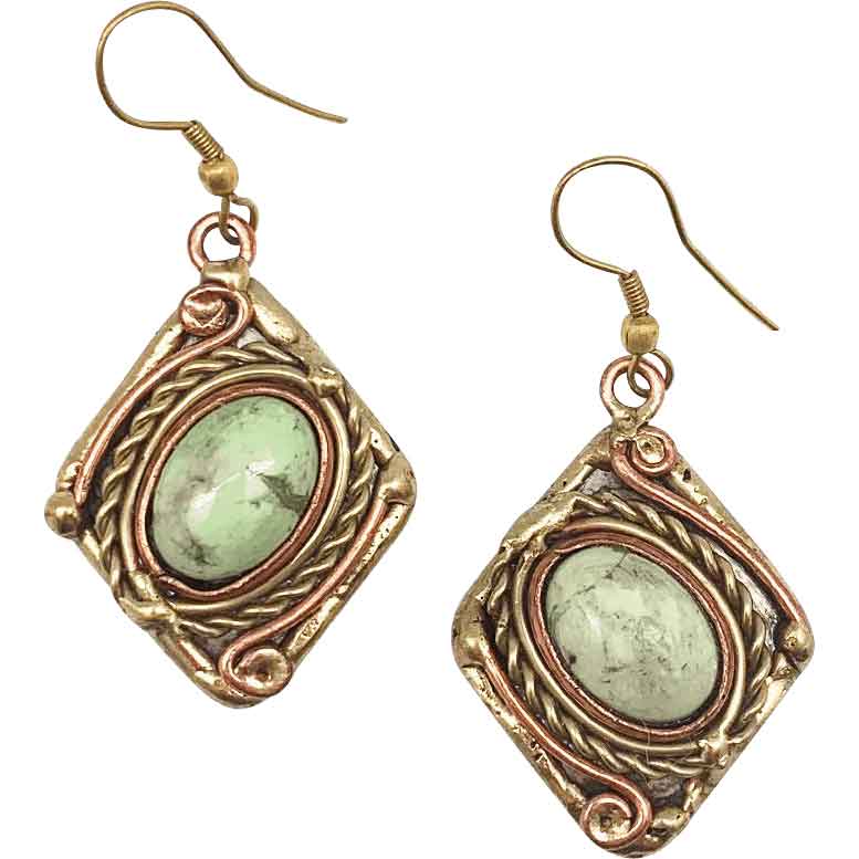 This pair of earrings is made from a mix of metals. The frame is stainless steel with copper and brass accents. Each earring has a natural Lemon Chrysoprase gemstone embedded within a brass frame. Please note the color of these natural gemstones may vary. The Chrysoprase gemstones add a unique jeweled charm to your look.