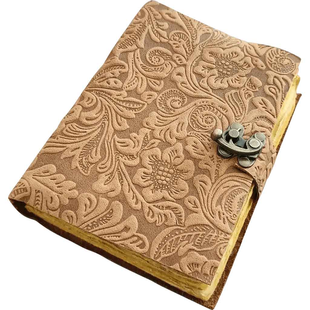 Handcrafted from leather, this medieval journal embodies a sense of elegance and the charms of the medieval period. Being made from leather, this journal has a rustic brown finish for a down-to-earth look. The front and back covers are embossed with leaves and flowers. This floral pattern adds natural, enchanting detail. There is handstitched binding on the spine keeping the pages together.