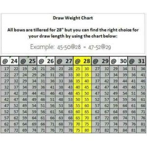 - The Draw Weight of a bow is measured in pounds and corresponds to the amount of force required to pull back the bow string. It is best to pick a draw weight that you can handle. All of the bows have a draw length of 28 inches. To match your draw weight to its equivalent in the 28 inch draw length, use the chart above. Find your draw length and weight and slide over along the row to the corresponding draw weight range under the 28 header. For example if you use a bow that is 47-52 pounds at 24 inches, you will use the bow of 55-60 pounds at a 28 inch draw.