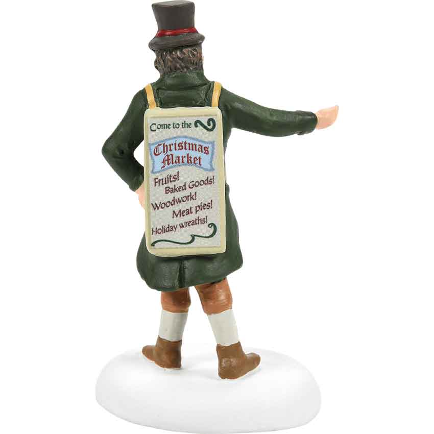 Men like the one in the Come One, Come All! figurine from the Department 56 Dickens Village collection were popular in the Victorian era. Made from porcelain, this highly detailed figurine depicts a man wearing a placard, also called a sandwich board. The board advertises a Christmas market and its wares. These wares include fruits, baked goods, woodwork, meat pies, and holiday wreaths. The man also wears a green coat, brown pants, and a black top hat. He holds out his right hand to the side. The man stands on a patch of snowy ground. Add this holiday figurine to your mini village or wintry landscape scene. This hand-painted miniature figurine is made by Department 56.