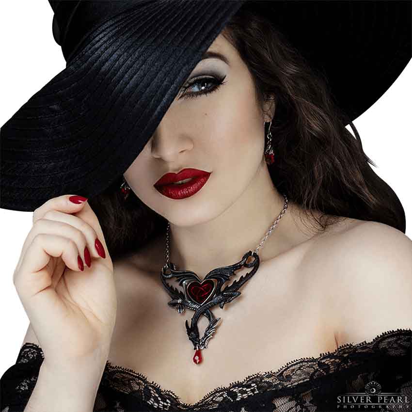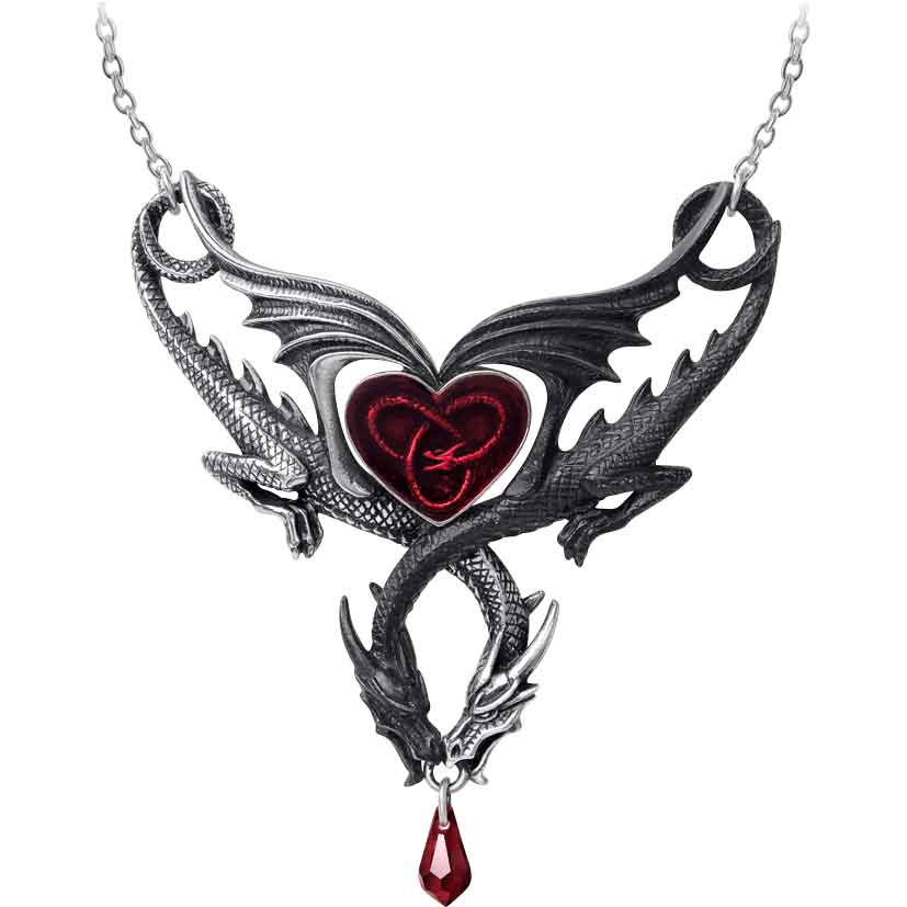 Meanwhile, the dragons necks cross over each other and then their heads meet at the bottom of the necklace. The dragons hold a ring in their mouths. A red Swarovski crystal droplet hangs down from the ring. The dragons wings form a heart in the center of the highly detailed necklace. There is a red enamel heart inside of the heart made by their wings. In addition, there is a trinity knot formed by a dragon inside of the red heart. This necklace makes a wonderful personal accessory or an addition to a fantasy jewelry collection. You can also give the Confluence of Opposites Necklace as a gift.