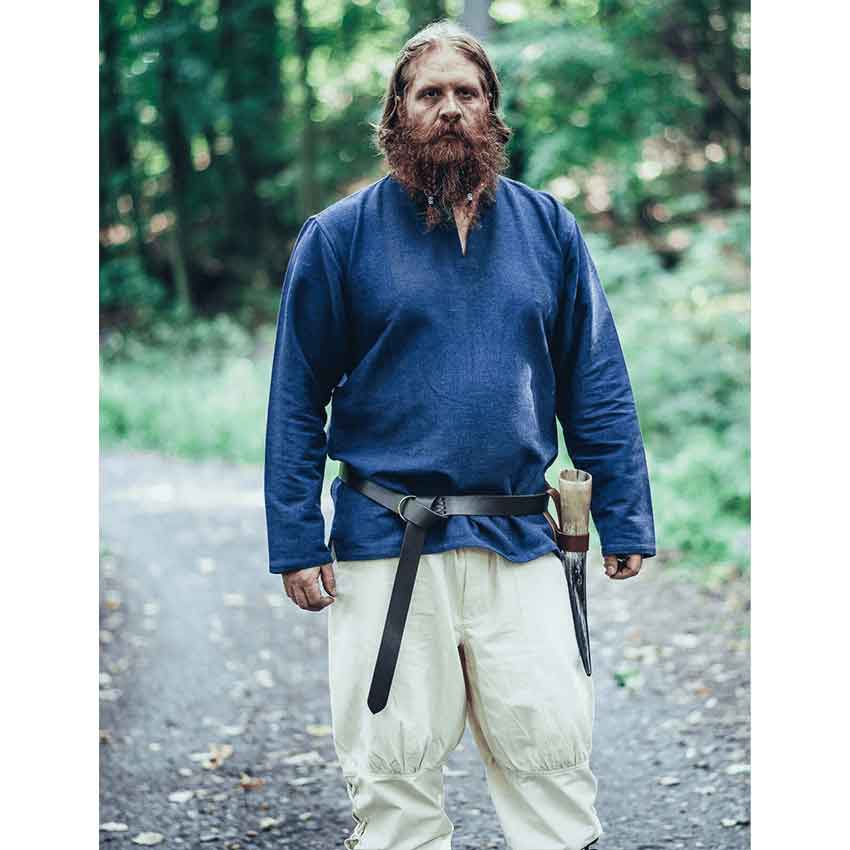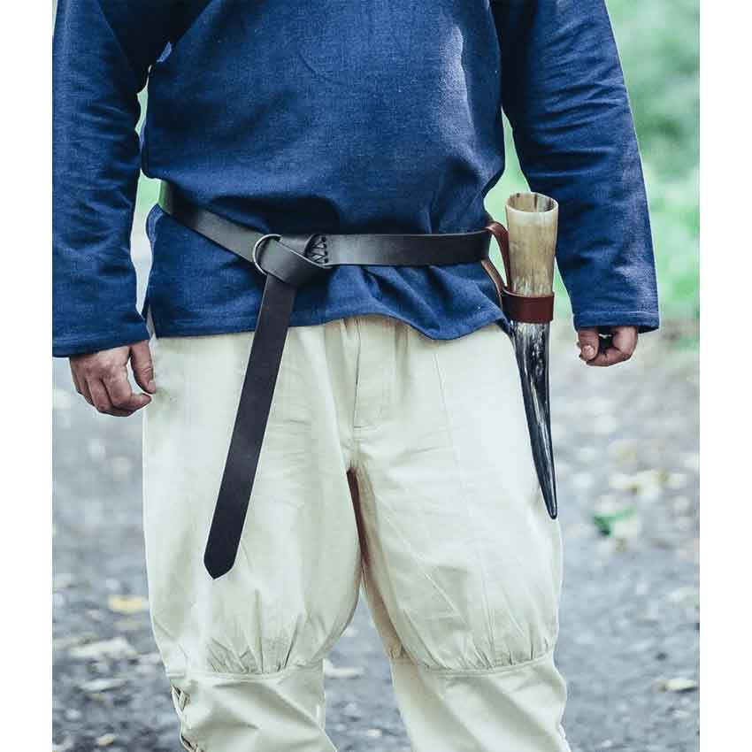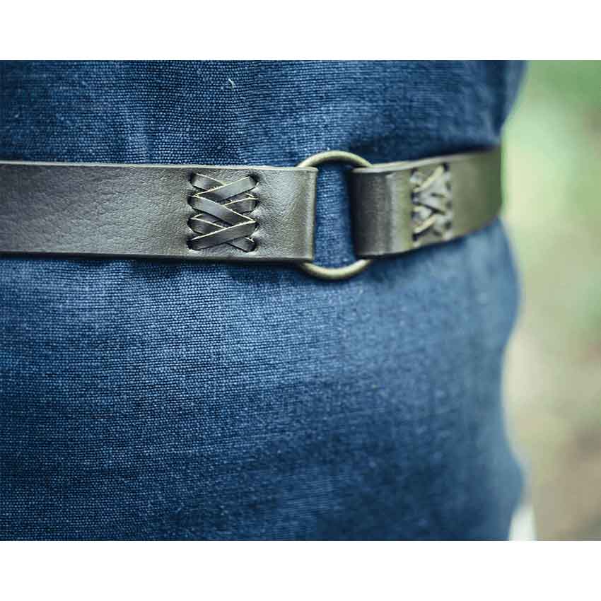 Crafted from leather, this medieval belt is an eye-catching accessory for any adventure. It’s black for a sophisticated look. When tied, it has enough length in the front to hang down and give you a distinct medieval style. The brass-toned metal ring at the end ensures your belt stays in place when tied. On either side, two extra rings are reinforced with leather stitching. Available in two lengths, you can choose the one that best fits you. The reinforced rings on either side add another layer of detail to appreciate.