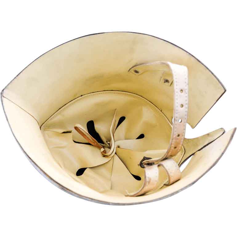 Inside the helmet is natural leather lining with an adjustable chin strap. You can wear it without an arming cap or add your own preferred padding before battle. This chin strap has a sturdy buckle and prepunched holes. Each side of the strap is riveted to the inner lining at two points. Simply slip the helmet on, adjust, and buckle the chin strap to keep it on your head.