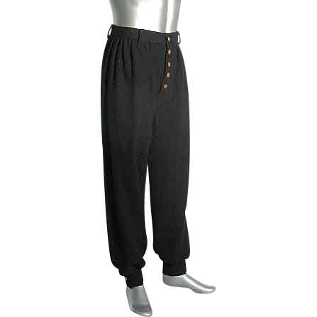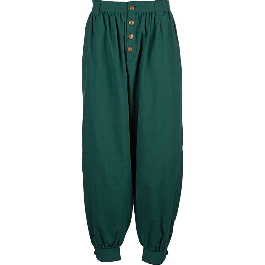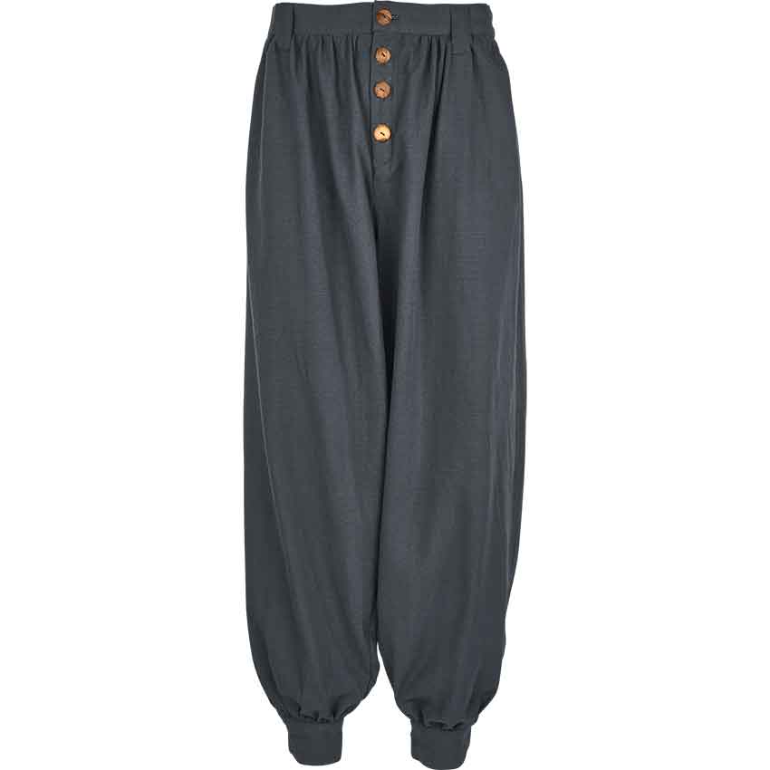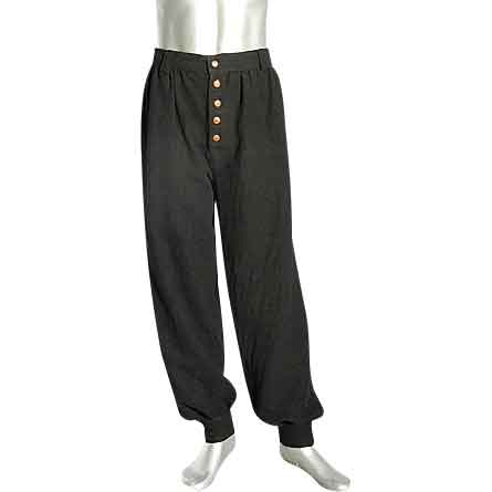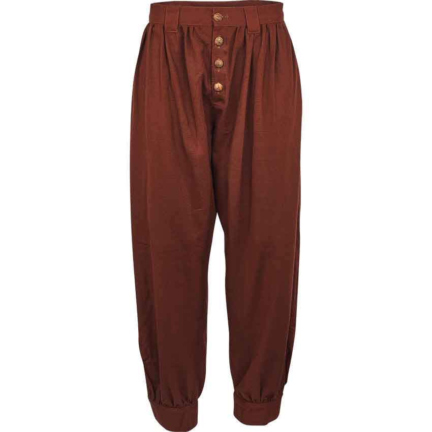 The Corsair Pants are a simple and functional pair of pirate-styled pants that are made from 100% woven cotton. These authentic, medieval-styled pants are all about function, and what they lack in decoration, they make up for in other areas. Being made from 100% cotton, these pants can be regarded as a medium-weight garment. They strike a great balance between heaviness of fabric and protection against the elements. These pants feature belt-loops around the waist and fasten using buttons along the fly. These pants have straight, full-length legs that run from waist to ankle. The legs are fitted around the ankle with a cuff, but are otherwise loose-fitting around the rest of the leg. The Corsair pants allow for a wide range of movement and an even wider range of activity. Corsairs can wear them on ships, farmers can wear them in the dirt, and knights can wear them into battle. With no decoration to speak of, the Corsair Pants can be expected to go anywhere and do anything, without the wearer having to worry about soiling their decorative trousers.