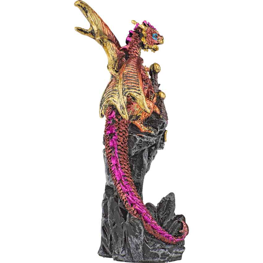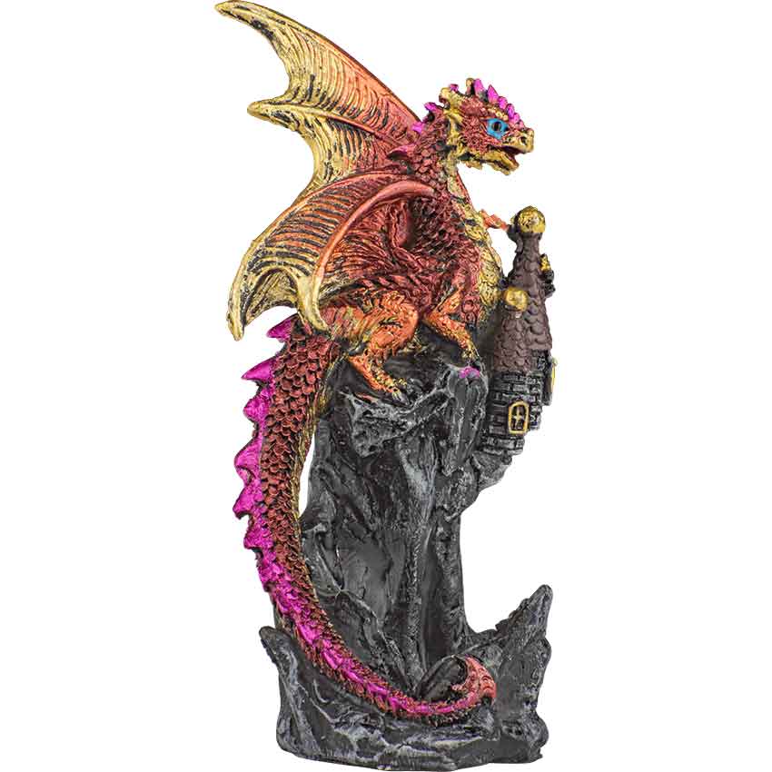 Something enormous and powerful just landed on the rooftop of the building. Our Crimson Dragon on Castle Statue features an intimidating dragon perched atop a cliff edge with their claw wrapped around the top of a castle turret. This majestic creature features highly detailed scales and lifelike castle walls, and features gold accents and magenta tips along the spikes of its long tail. You arent mistaken to be worried when the room shifts, and hope this creature is on your side as you marvel at this dynamic dragon. A great decor item or gift idea for friends and loved ones, make this expressive statue part of your collection today, and dont get on their bad side. Youve been warned!