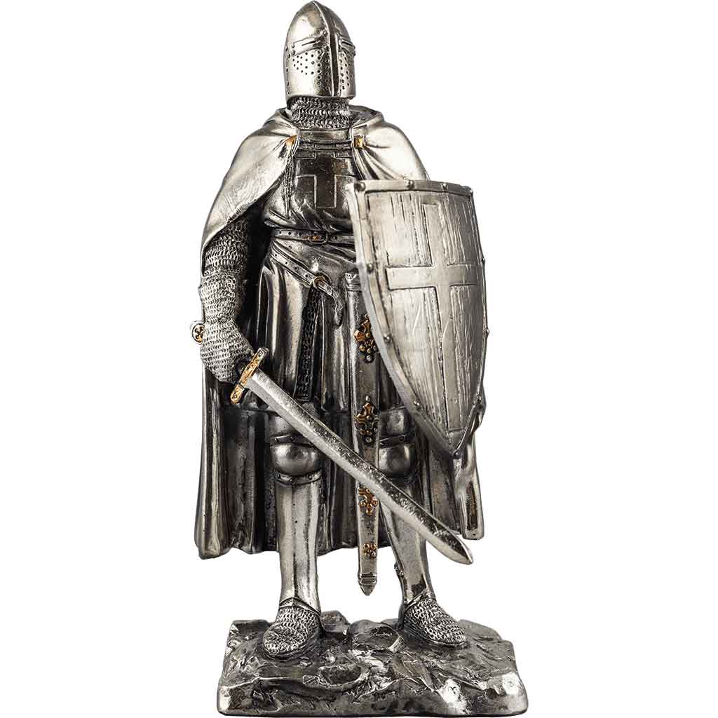 The Crusader Knight Statue depicts a classical interpretation of a medieval warrior in armor standing on a base modeled on rocky ground. This knight features the garb of a Crusader and a Templar, wearing mail armor under classic Templar robes. This knight wears a classic great helm and plate greaves, along with a mail hauberk and gloves. Over his armor, the knight wears simple robes and a cape. The knight holds a cross-decorated kite shield in one hand and a longsword in the other. This great medieval statue is made from high quality cold cast resin, which has been hand painted for detail and electroplated to give it a stunning metallic finish. The Crusader Knight Statue is big on detail at a convenient size that any enthusiast or collector would be proud to display on a shelf, end table, or desk.