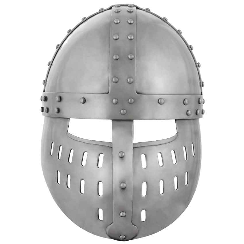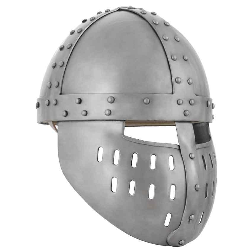 Helmets of the Middle Ages could be quite varied, and this Crusader Spangenhelm with Face Guard is the perfect example of this. The design of the helmet is quite unusual and distinctive, while also being rather intimidating and fully protective. The spangenhelm was a popular helmet of the Middle Ages, and for good reason, as it was a simple yet highly effective helmet that lasted well into the Crusades. This spangenhelm is quite distinctive and unique in its look, though. It features a classic spangenhelm construction from the top down, possessing a skullcap that is reinforced by riveted strips of metal to provide secure defense for the crown of the head. Attached to the rim of the helmet is a metal faceguard that features ventilation cut-outs, as well as a riveted centerline that serves to enhance the protective strength of the face guard. All in all, it is an intriguing look that is quite effective and quite intimidating to see. As impressive as it looks, this helmet is further backed by its construction, which utilizes 14 gauge steel to ensure an impressive level of protection. The interior of the helmet also features leather suspension lining, as well as a chin strap that helps to keep the helm on a warriors head when worn. For a truly distinctive look and feel, you will want a helmet that is totally unique, and none will compare with uniqueness or quality when it comes to this impressive looking Crusader Spangenhelm with Face Guard.
