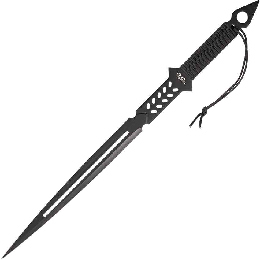 The solid, single-piece sword widens into points to form a crossguard. Black cord wraps around the grip, ending in a tassel at a hole in the pointed pommel. This machete comes with two matching throwing knives and a black nylon scabbard. The throwing knives also feature angled cutouts and pointed pommels. This unique machete makes a functional addition to your outdoor gear as well as a blade collection.