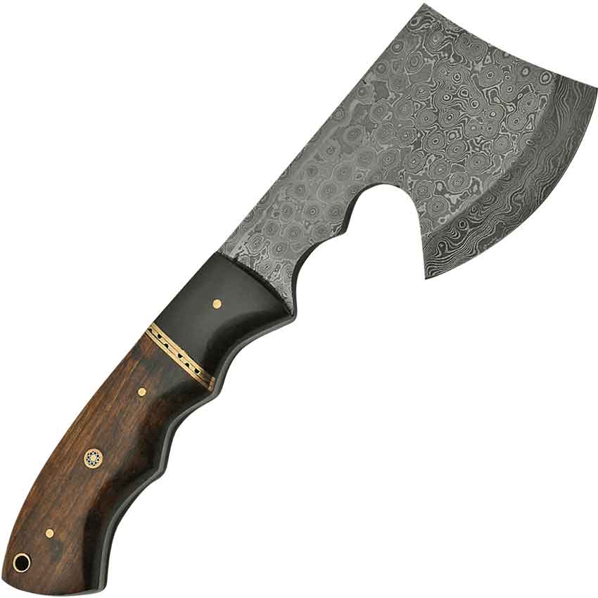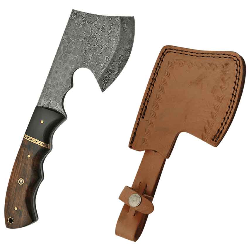 Have you ever given a hatchet as a gift? This Walnut Camp Hatchet is a handsome survival tool or collectible weapon. The beveled blade is equally well suited for throwing competitions or clearing vines and brush in your yard. Created by folding two or more types of molten steel together, each Damascus steel axe displays a unique pattern. The full tang hatchet is contoured at the handle for a comfortable grip. Brass fittings gleam against the rich walnut wood handle that has been carved to match the shaped tang of this hunting hatchet. A brass-lined lanyard hole allows for custom cord attachments. A custom fit leather sheath is stitched and tooled to protect your survival hand axe when not in use. The Walnut Camp Hatchet is a fantastic tool to keep with your camping gear or bug-out bag.