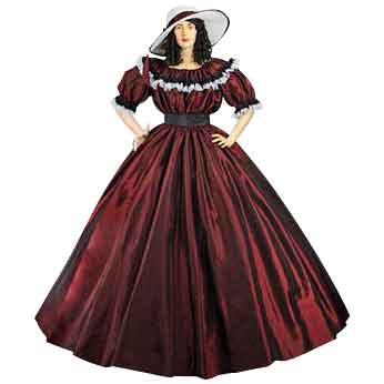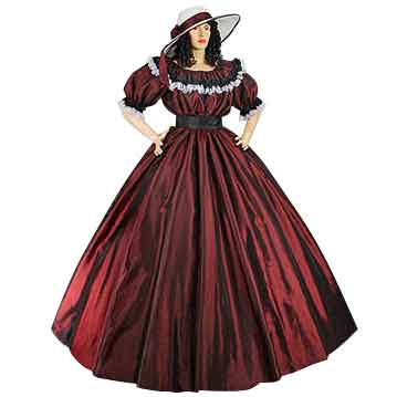 The Dark Red Civil War Dress is a beautiful example of a renaissance-styled dress that remained popular in fashion throughout the U.S. Civil War. This elegant dress is made of elegant, high-quality materials, which only add to its appearance. Made from high-quality taffeta, this dress behaves quite similarly to silk, down to the look, the feel, and even the illustrious shimmer. This beautiful dark red dress features a raised waistline which is decorated with a black band that is secured at the back of the dress with a knot. Black ruffled trim and white ruffled trim decorates the elaborate, pleated collar. The half-length sleeves are primarily loose-fitting but are fitted to the arm via a black-on-white ruffled cuff just above the elbow. The Dark Red Civil War Dress is fastened with a zipper on the back, while the interior is fully-lined. This dress is pictured with the Civil War Hoop Skirt (MCI-240), sold separately. Please note that the hat pictured above is also not included with the dress. Elegant and simple, the Dark Red Civil War Dress is designed to unearth, accent, and compliment a womans natural beauty all without the need of gaudy or tasteless decoration.