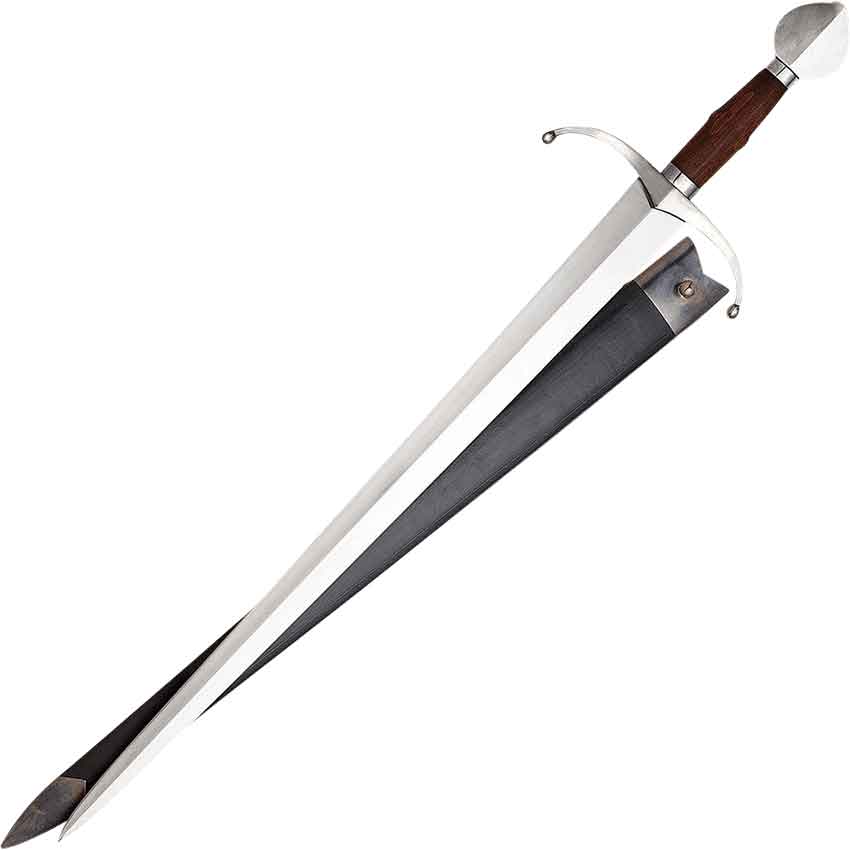 Finally, this sword comes with a black leather scabbard. It has a metal chape and throat. The throat has a pin for hanging the scabbard. The De Joinville Sword is great for any warrior to wield at a historical reenactment.