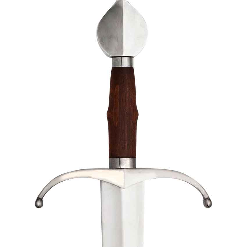The De Joinville Sword continues with a curved crossguard. This steel crossguard curves towards the blade. The ends of the guard have rounded, ball-like tips. Also, the crossguard features a ridge in the center. The hilt continues with a wooden grip. It features a ridge in the center and steel bands on the ends. The hilt ends with a circular pommel. It has a ridge down the center as well.