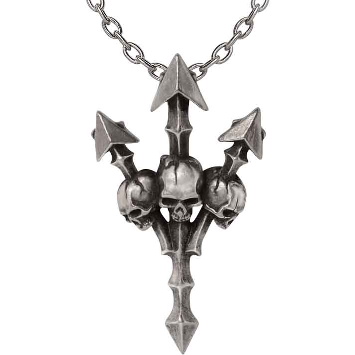 Made by hand from skilled artisans, this gothic necklace blends the artistry of the age of myth with the macabre charm of taking skulls as trophies from the fallen. This hypoallergenic necklace is made from lead-free, nickel-free English pewter, showcasing an antique silver finish. Pewter jewelry does not tarnish like silver jewelry. This finish gives the trident and the skulls a weathered, ancient look as if from Ancient Greece. Attached to the trident is a silver chain. The chain has a lobster clasp for an adjustable fit. Not only is this gothic trident necklace easy to wear, the silver chain provides great contrast to the pendant.