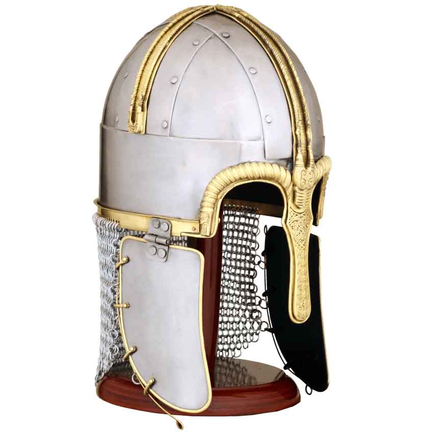 The original Coppergate Helmet, also known as the York Helmet, is one of only four Anglo-Saxon helmets discovered, to date. And now, you can own a fantastic and impressive reproduction of that remarkable piece, as this Deluxe Coppergate Helm. Like the original, this helmet consists of a rounded composite skull, with each element being riveted and secured together. Two cheek protectors hang down from the sides via hinges, while a mail curtain hangs down from the back, to offer protection to the wearers neck. Brass ornaments and fittings adorn the helmets crown and rim, while the large nasal guard is also finished in brass, and accented with carved letters and a small dragon head design at the apex. The helmet is made entirely in 18 gauge steel, and it is offered in one size. It comes complete with an adjustable leather liner, as well as with a chin-strap for easy and comfortable wearing. Based on an actual historical artifact, this Deluxe Coppergate Helm offers impressive and fine detailing, as well as an authentic style that is perfect for creating the most realistic looking of reenactment costumes and historical styles.