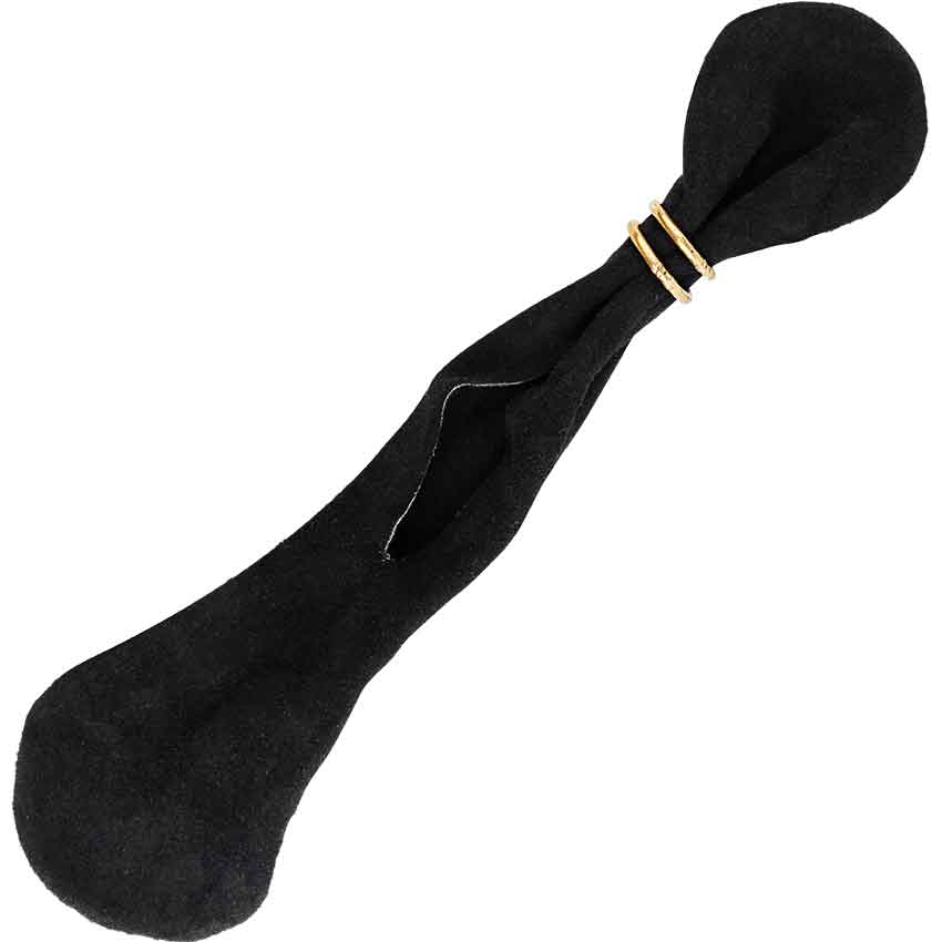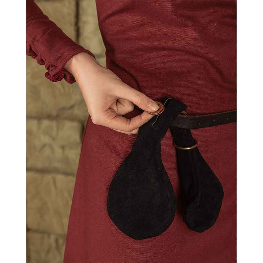 You sit down at a table in the tavern. You decide to order a drink and pull out the Denarius Suede Pouch to pay the bartender. This suede pouch comes in two color options. The pouch has a unique design. It has two round sections. These sections connect to each other with a narrower straight section in between. The straight section has a slit in the middle as an opening. To keep the contents of the pouch secured, it has two brass rings. Each ring slides to either allow a side access to the slit or to close it off. Traditionally, this style of pouch hangs on a belt with a section on each side. Therefore, it is advisable to keep the weight on each side to a similar level. The Denarius Suede Pouch makes a great accessory for a historical reenactment or cosplay event.