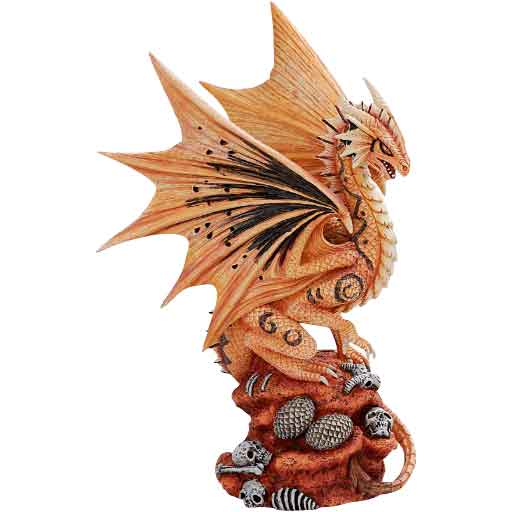 Many inhospitable places are the homes of dragons. Deserts are no exception, especially for the fierce dragon displayed in the Desert Dragon Statue. Made of resin, this sand colored dragon stands tall ready to dispatch its enemies. The bones of previous enemies lay below the dragon, next to the eggs it guards. Black designs decorate the dragons skin. It looks down ready to swipe its claw as it stands on a rocky ledge. This hand-painted, fantasy statue makes a wonderful collectible or a gift for a dragon enthusiast.