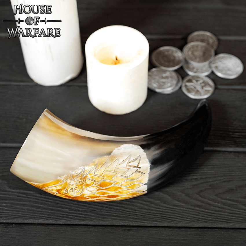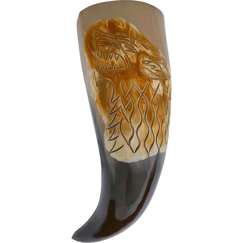 Howls fill the midnight air. You raise the Direwolf Drinking Horn in honor of the wolf packs that surround you and set the horn back down. This natural drinking horn features an engraved wolf head design. The wolf has its mouth open, showing off its sharp teeth. Finally, this Viking-style horn is food safe and wonderful for drinking your preferred beverage. The Direwolf Drinking Horn makes a great addition to your medieval feast or home decor style. Bring it to your next reenactment or use it to decorate your office.