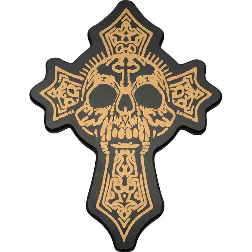 Moving down the length, the blunted double-edged blade has intricate magical symbols running down the center. This adds more dark fantasy style to the design. This decorative sword comes with a black wooden display plaque. The plaque is in the shape of a Celtic cross with intricately engraved golden accents and a fanged skull.