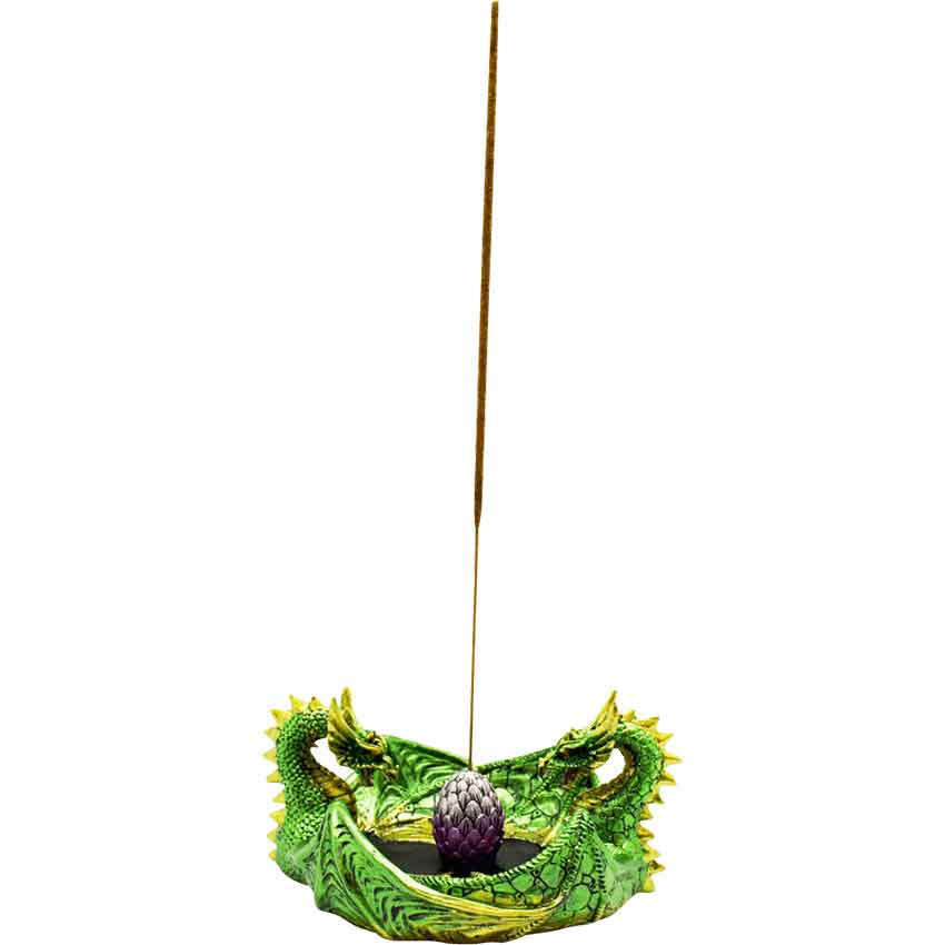 What could be better than a dragon enjoying incense? Two dragons of course, like the ones in the Double Dragon Incense Burner and Ashtray. Made from cold cast resin, this hand-painted incense holder depicts two green dragons. The richly colored dragons are on opposite sides of the circular burner, facing each other. They have their wings spread out, creating the sides of the intricately detailed burner. The green dragons have highlighting along their spines and at the tips of their wings. Between the dragons, the base of the burner is black. In the center, there is a purple scaly egg. The egg holds a stick of incense, not included. This ashtray and incense burner combo makes a great addition to any collection or home decor.