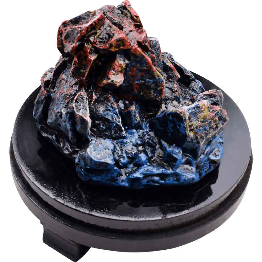Finally, this dagger comes with a wooden display stand. It has a black circular base with three feet on the bottom. The display stand features a dark, rocky formation on top. It has red and blue highlighting. This formation has a slit at the top for holding the dagger. This dragon dagger makes an elegant addition to any weapon collection or fantasy display.