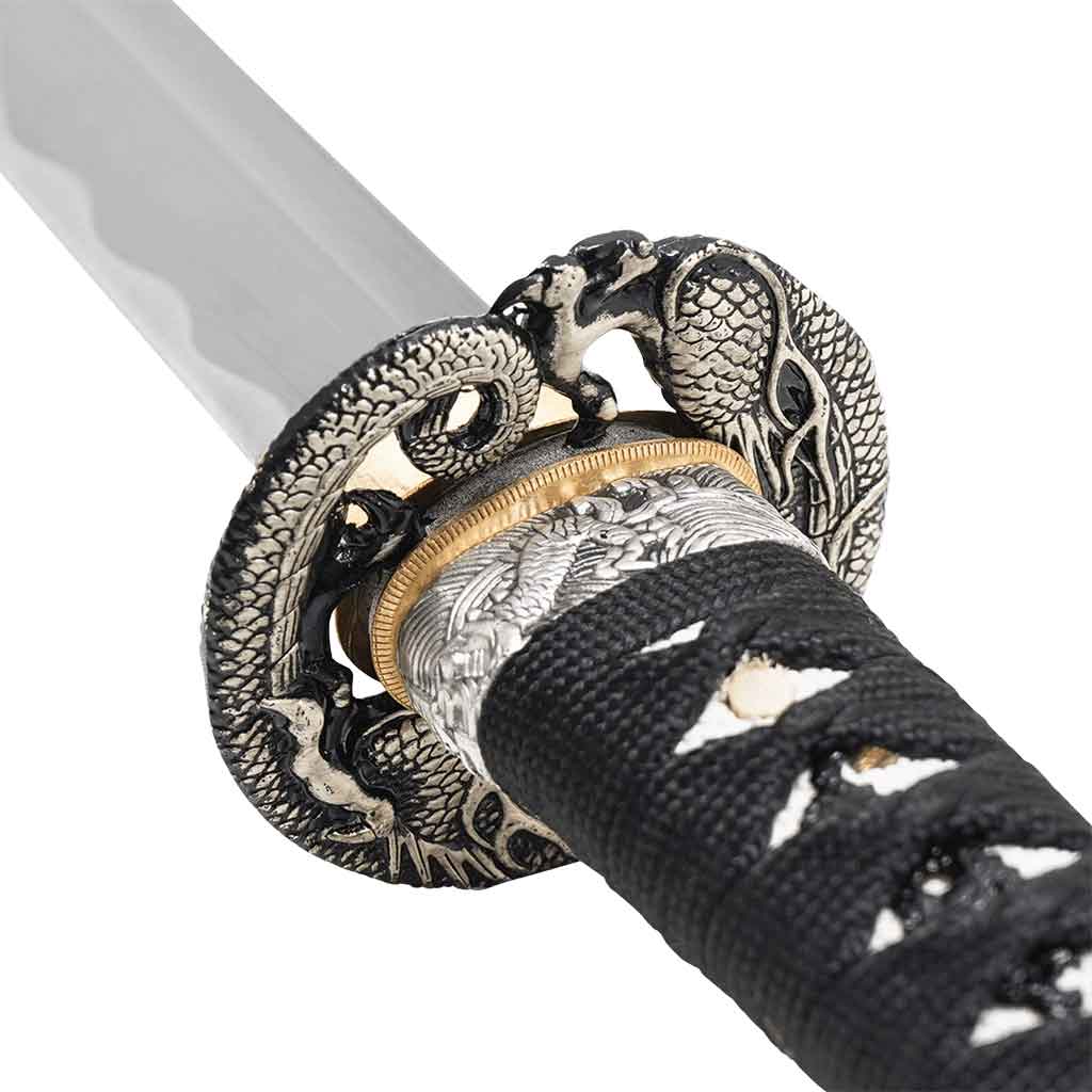The wooden handle is wrapped in a layer of faux white ray skin, then wrapped with black polyester cord, known as tsuka-ito. Embossed on the pebbled faux ray skin is a zinc alloy dragon menuki with a blackened finish. Menuki refers to the dragon decoration on the handle just underneath the tsuka-ito wrapping. At the bottom, the hilt is wrapped through a silver kashira pommel.