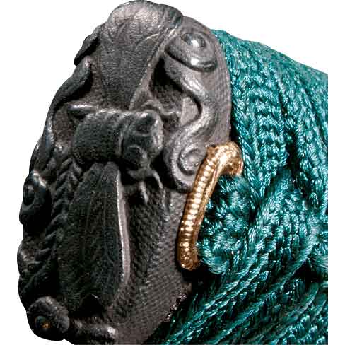 Thicker, wider, and heavier than its feudal era inspiration, the Dragonfly Katana features gorgeous traditional style made with updated materials and techniques for the modern warrior. Its black iron furnishings bear a dragonfly motif. Teal-green silk cord wraps the black same (rayskin) used on its handle, and the blade is polished and curved. More than just a beautiful display piece, this Japanese sword is made of 1055 high carbon steel, its blade heat treated and curved, terminating in a long iris leaf point for maximum cutting and slashing potential. The traditional samurai sword comes with a black lacquered wood scabbard and two protective bags, including an intricately decorated display bag made of heavy silk metallic brocade and a blue travel bag for safe transportation.