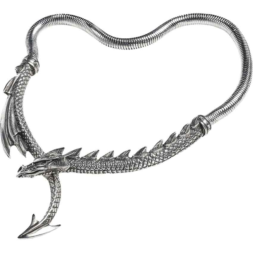 In Norse mythology, the Viking woman Thora Town-hart was guarded by a dragon that could wrap itself around a hill three times. With the Dragons Lure Necklace wrapped around your neck, you will be even more secure than she was! This necklace truly embodies the serpentine form of a dragon. Its arrow-tipped tail and spiny neck are composed of solid pewter and clasp together at the front via a magnetic catch, while the rest of its body is composed of a continuous, highly flexible snake chain. The Dragons Lure Necklace makes a fantastic piece of gothic or fantasy jewelry that is sure to bring a bit of magic to your ensemble.