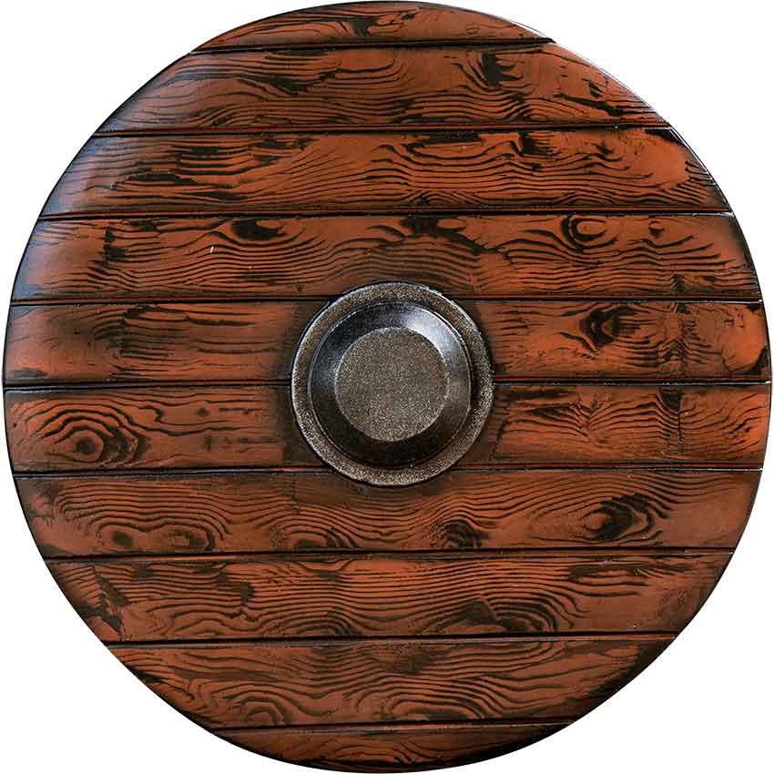 Whether you are a peasant, Viking, barbarian, or other character, you need a sturdy shield to do battle with. Use this Wood Drang Round LARP Shield. Made from hard EVA foam, this shield has a slightly domed shape and a latex coating. The front of the shield looks like planks of wood with a boss in the center. The steel-colored boss is round with a flat face. On the back, the shield is black with a steel-colored rim around the boss with two points facing opposite directions. In the center of the boss, there is a brown suede-wrapped handle for holding the shield. This LARP shield is ideal for LARP battles, cosplay events, and theater productions.