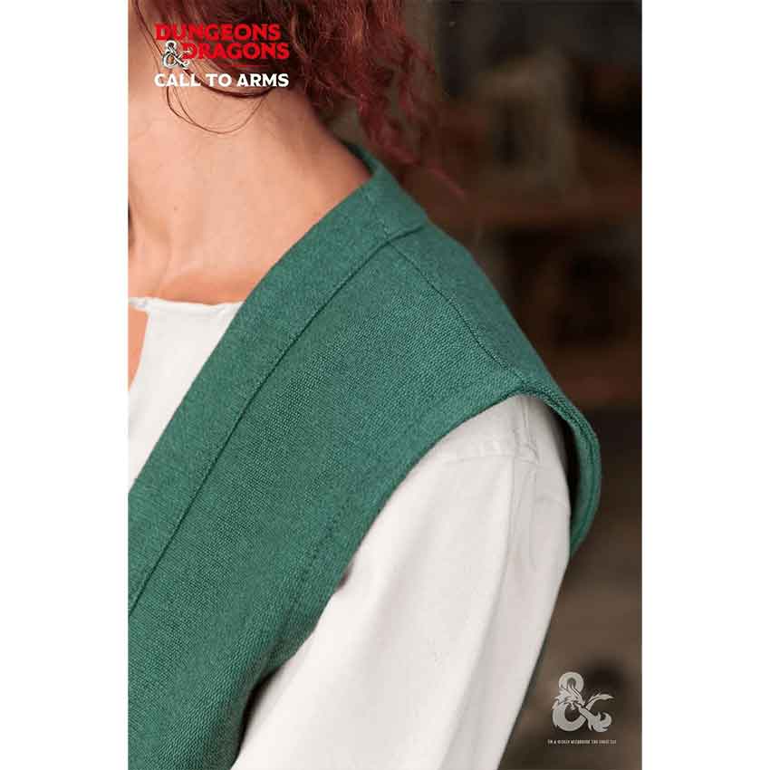This D&D cosplay vest features adjustable drawstrings at the waist. The ends of the drawstring thread through brass eyelets at the front. Pull them tight to create a cinched look or tie them more loosely for a relaxed fit. Offered in two earthy tones—green and brown—the sleeveless vest captures the essence of the Druid class.