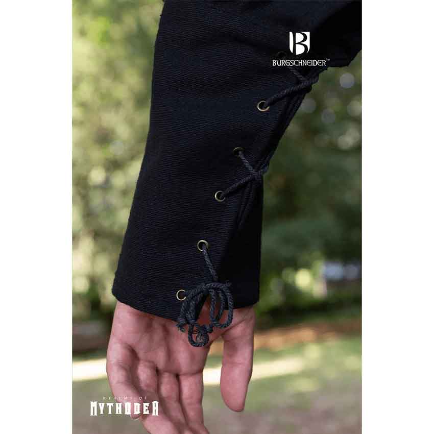 Robes are great layers for outfits, armor, and costumes. This long-sleeve black robe’s convenient design makes it easy to wear. Tie the long wrist cuffs until you achieve the perfect fit, leaving your hands free and unhindered. Stand out with a sense of dark fantasy style at LARP events and Renaissance fairs.