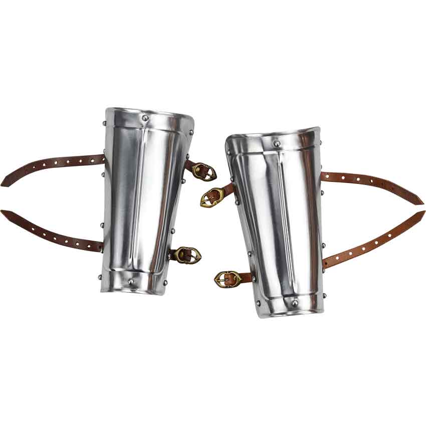 Good arm protection is a must whenever you are heading into combat. And these Economy Steel Arm Guards offer good, solid protection, which will keep your arms safe from impending strikes, while leaving you free to return your own counterattacks. Crafted entirely in fine 18 gauge mild steel, these bracers are made to be light yet functional. The steel bracers fit around the arm and are reinforced with rivets along the sides, while also possessing a ridge down the center, for added strength. They are offered in one versatile size, and come complete with leather straps and buckles, which are used to secure the arm guards to your forearms. Crafted with defense in mind, these Economy Steel Arm Guards are great for reenactments and for medieval events, serving well as both costume armor and functional protections. Plus, they are also quite affordable too, ensuring that anyone can have the protection that they need.