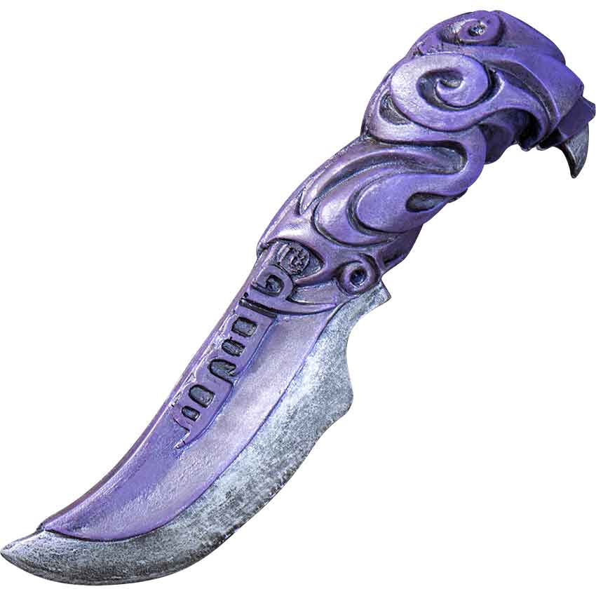 Even elven rangers need to carry a smaller blade on them. Be sure to check out the Purple Eldarian LARP Throwing Knife for your adventure. Made from polyurethane foam, this LARP knife has a latex coating over its durable construction. With its coreless construction, this knife is safe for throwing. Designed by Atelier Fantastic Art for Epic Armoury, the knife features an ornate purple handle and a single-edged blade. Carved swirls adorn the pommel and grip. In addition, the pommel forms a small spike at the end of the handle. It points towards the edge side of the knife. The carved texture from the pommel continues onto the spine of the blade as smaller, elven runes. Next, the blade is wider than the grip. It also features a trailing point tip with a silver-colored edge. Add this throwing knife to your LARP ensemble. It also works well for cosplay conventions.