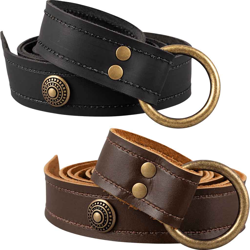 Made right here in the USA by Dragon Forge Leather, this 5/6 ounce leather ring belt is 1.25 inches wide. This makes it a durable and reliable belt for your outfit that lets you accessorize with a hint of regal charm. This wide leather belt is available in two colors, Black and Brown, perfect for complementing a wide variety of outfits and their color palettes. It is also available in two lengths, 60 Inches for smaller waist sizes, and 72 Inches for larger waist sizes.