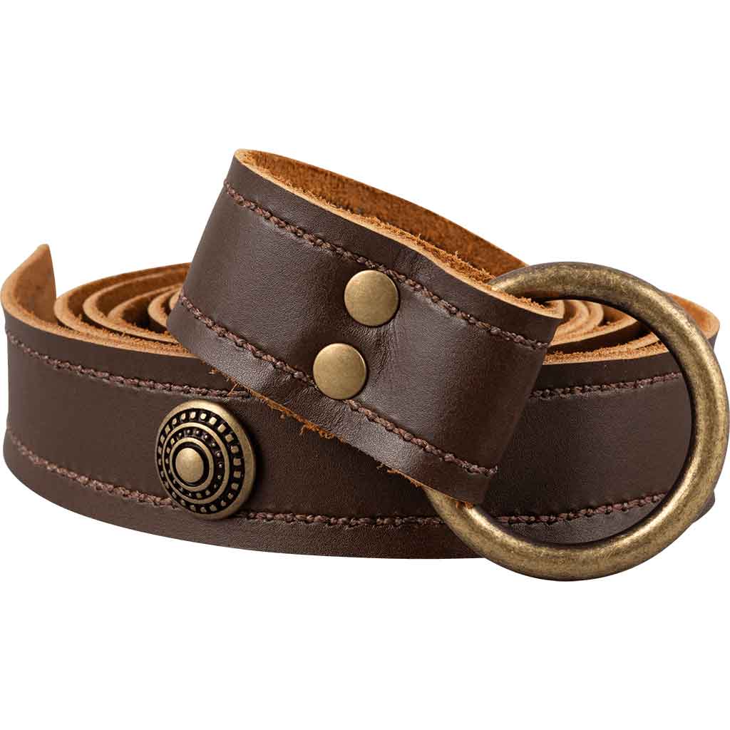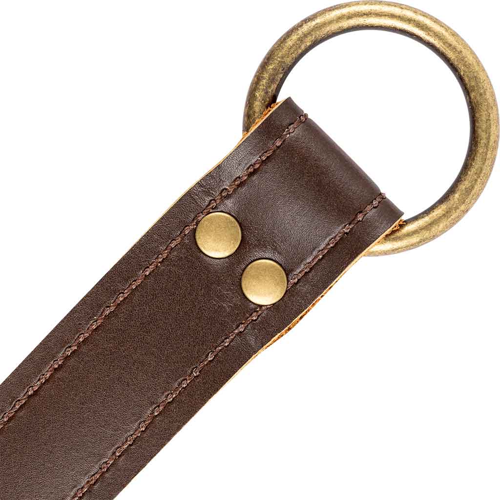 Nobles, knights, and all kinds of characters can benefit from wearing this embellished belt. Buckle this leather ring belt around your waist and stand out from the crowd on your adventures. Not limited to just lords and knights, all kinds of medieval and fantasy characters can style this belt with their ensembles. It may have brass accents, but you can also wear a variety of other accessories over this belt. This medieval fantasy leather belt can hold weapon frogs, potion carriers, and more.