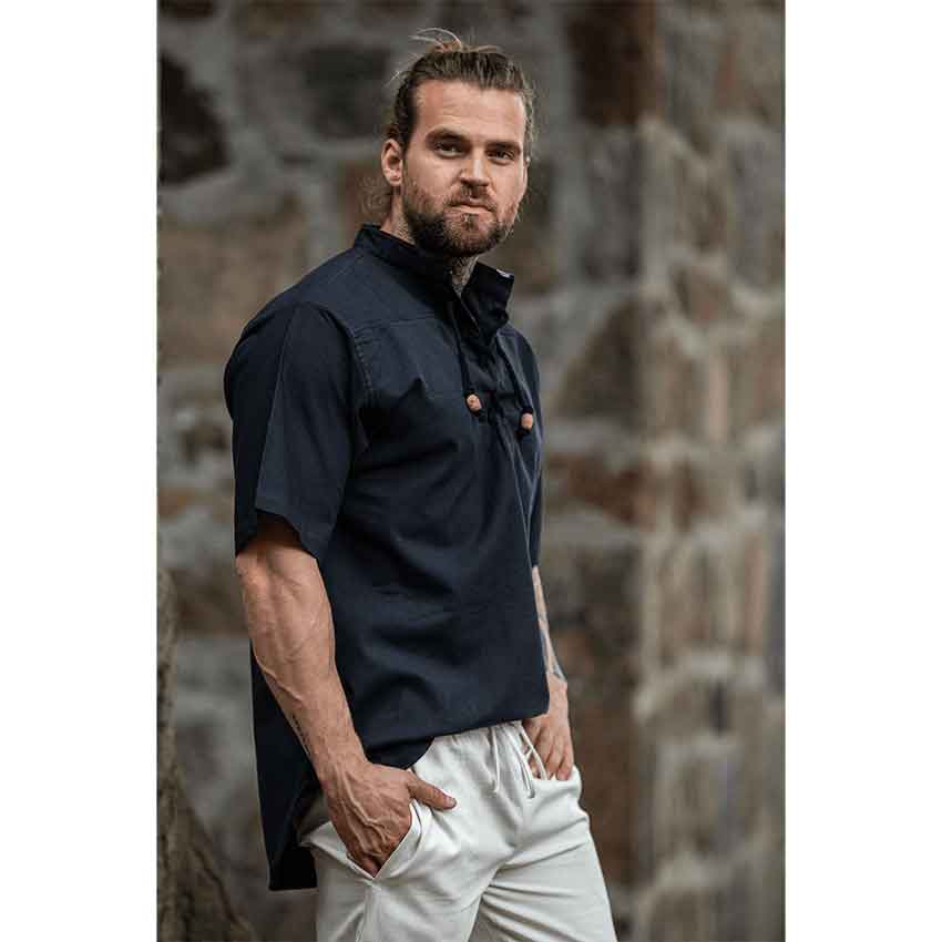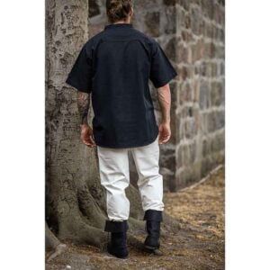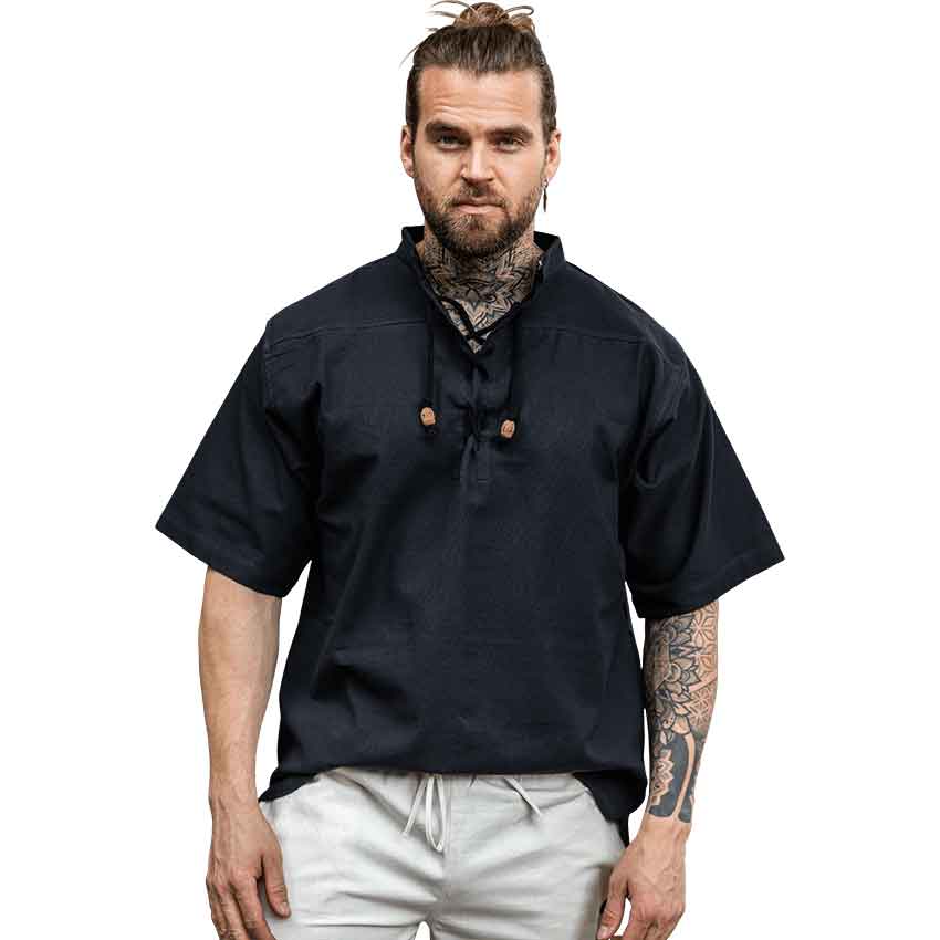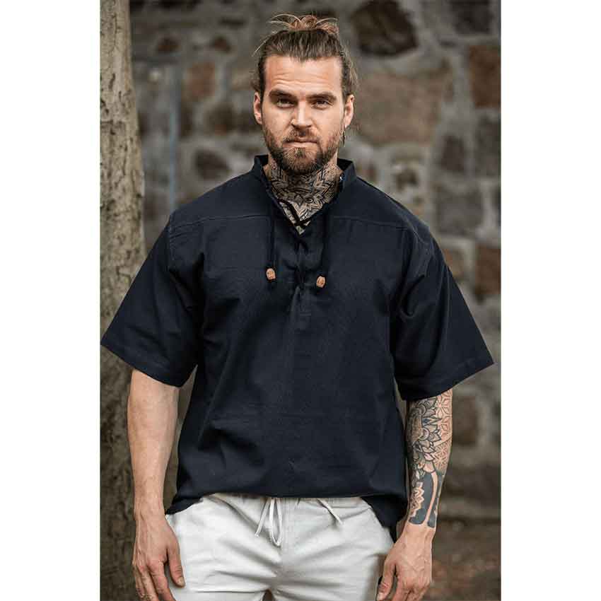 Inspired by the charm of Viking and medieval attire, this shirt captures the essence of a bygone age. This captivating shirt is crafted from pure cotton. Its black hue complements a wide variety of medieval and fantasy outfits. With a stand-up collar and short, wide sleeves, this shirt is designed to give you a distinct medieval silhouette.